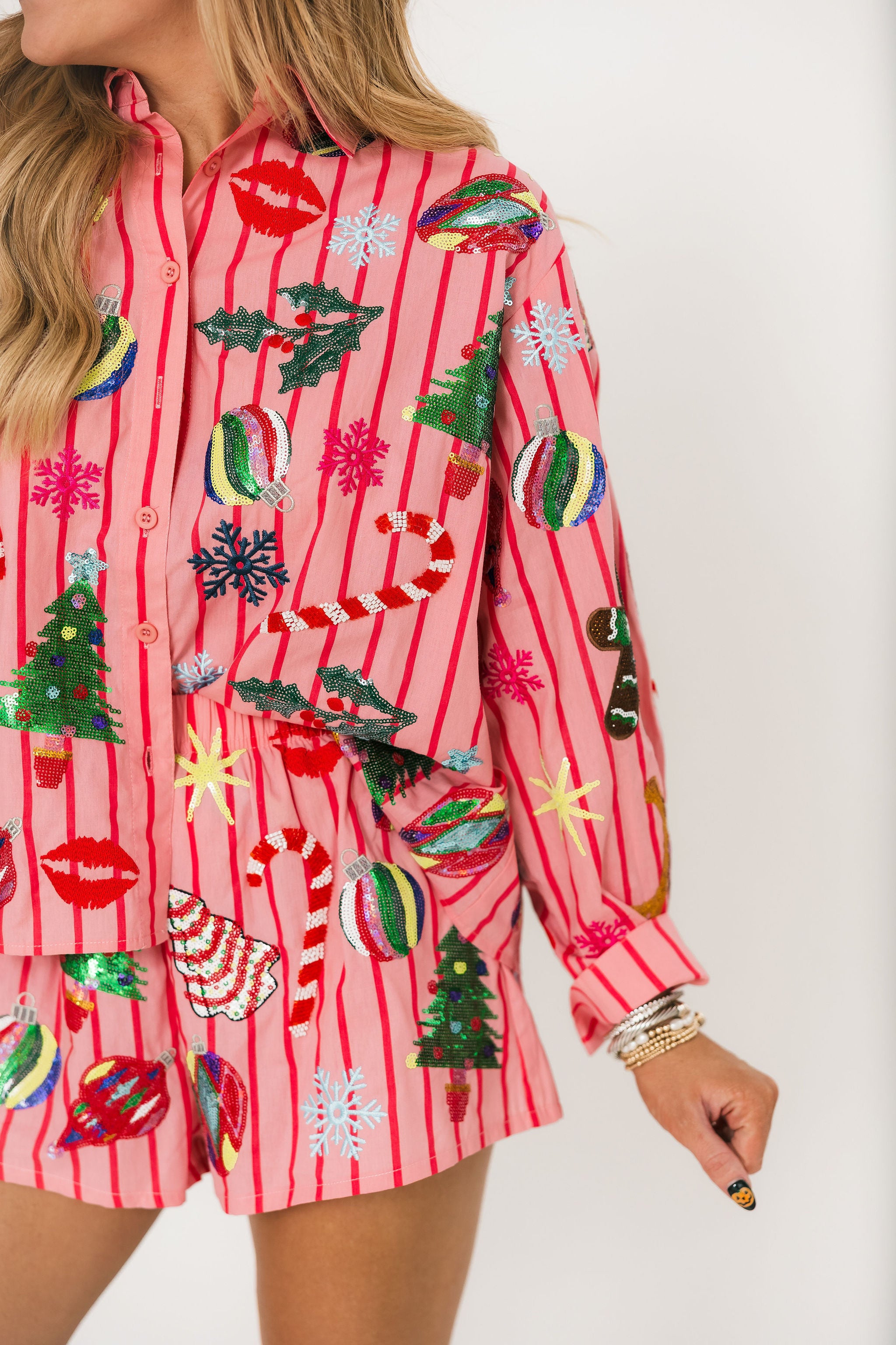 Light Pink & Red Stripe Christmas Icons Cotton Button Up Top | Queen Of Sparkles