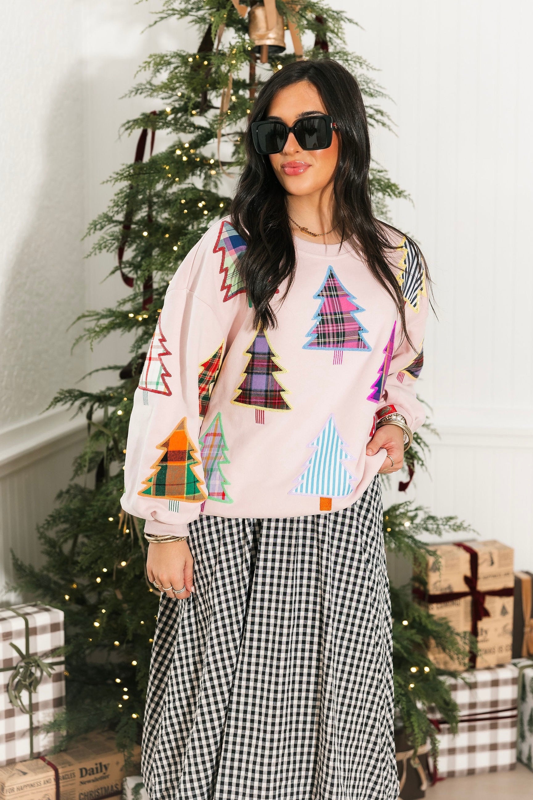 Light Pink Multi Plaid & Stripe Christmas Tree Sweatshirt | Queen Of Sparkles