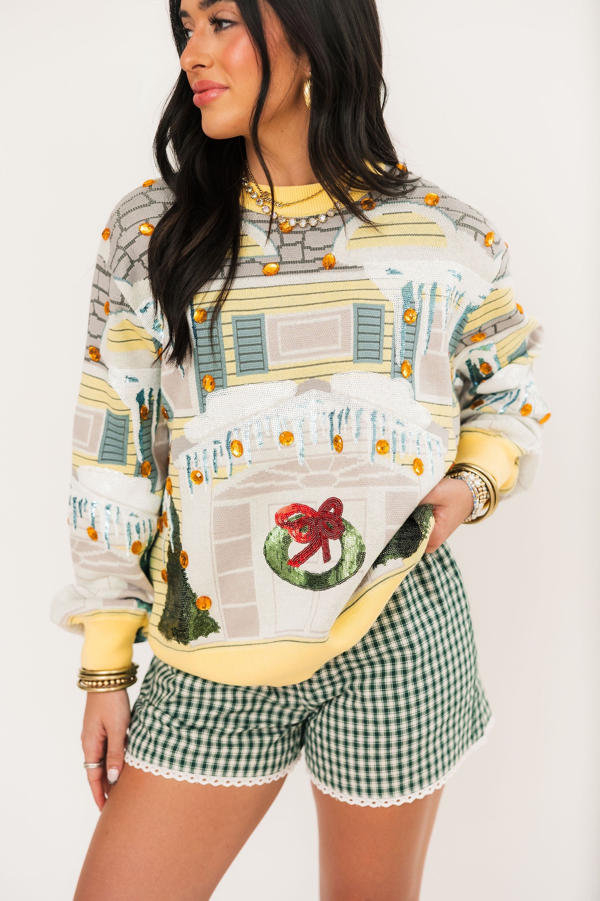 Yellow Trim Griswold House W/Wreath On Door Sweater | Queen Of Sparkles