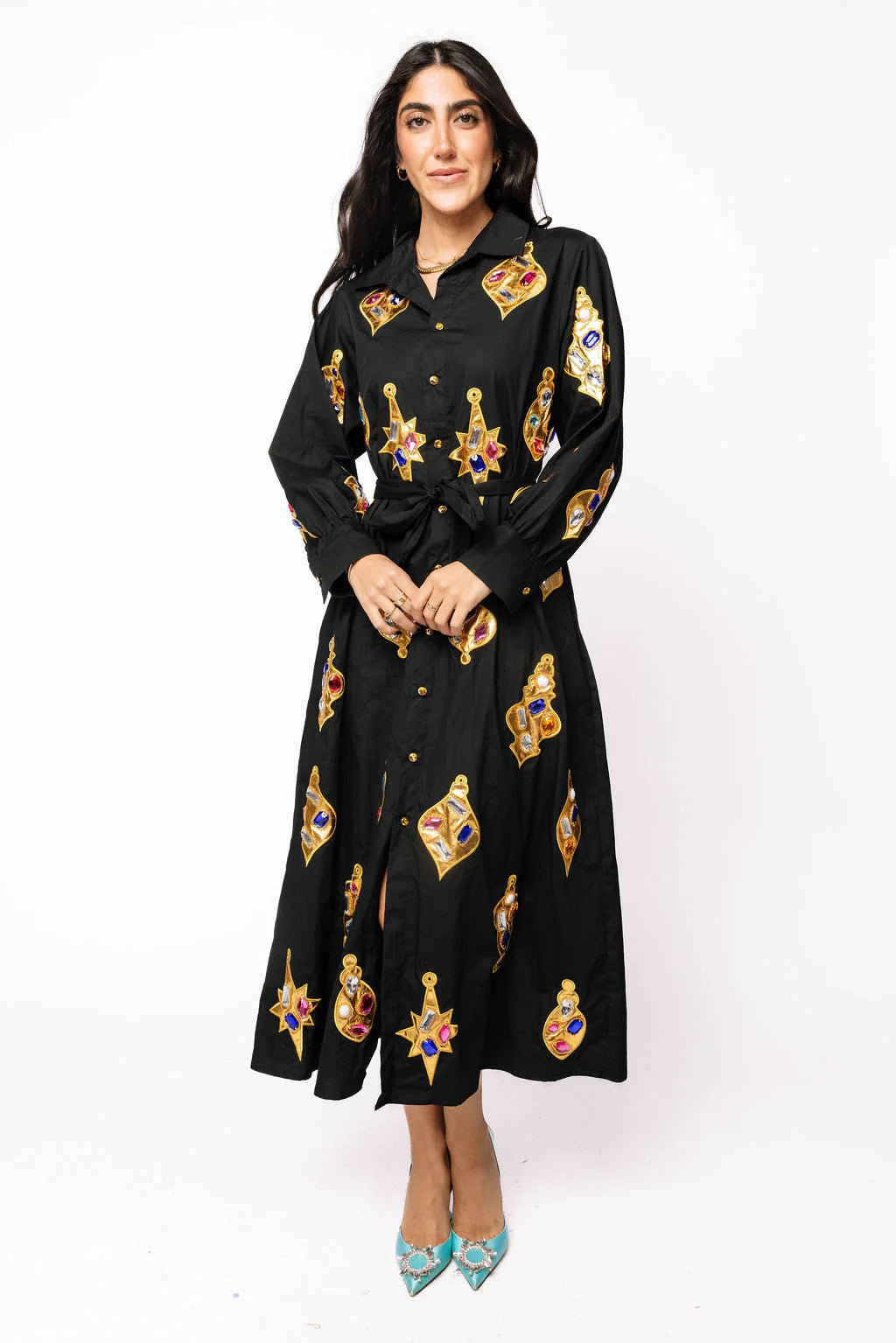 Black & Gold Jeweled Ornament Cotton Tie Midi Dress | Queen Of Sparkles