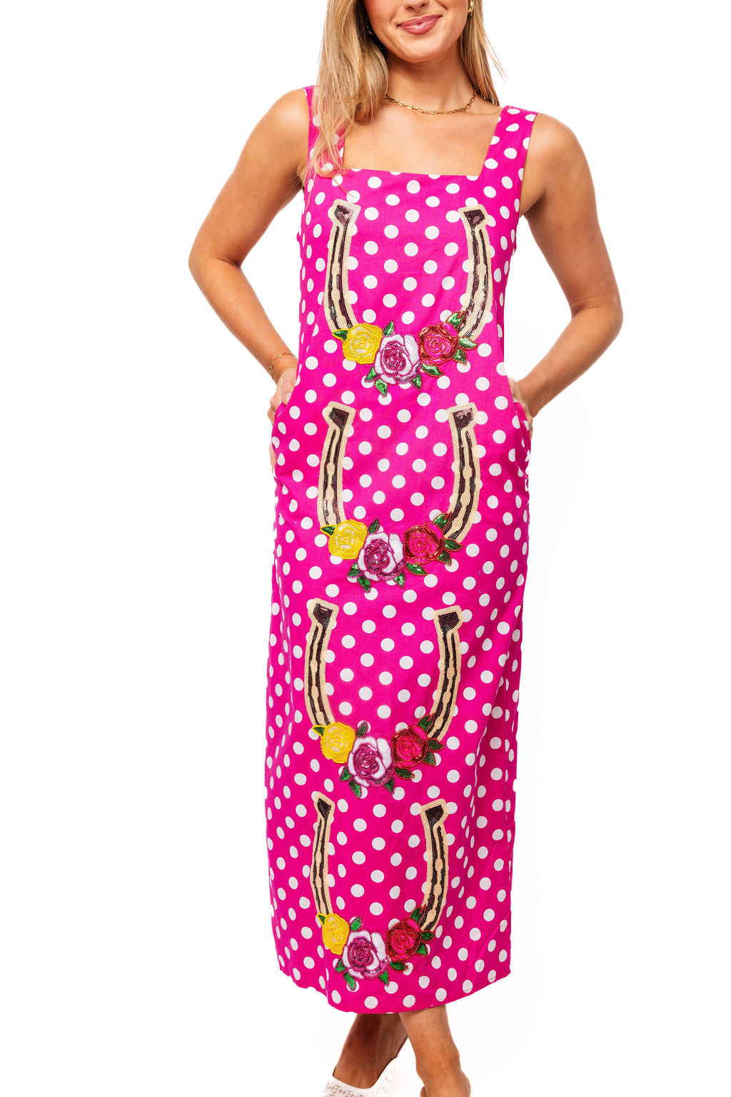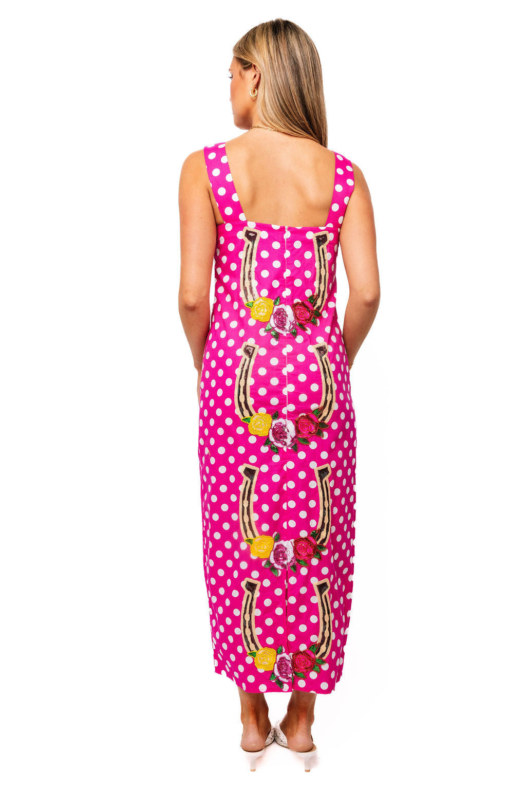 Hot Pink & White Polka Dot Rose Horse Shoe Cotton Midi Dress | Queen Of Sparkles