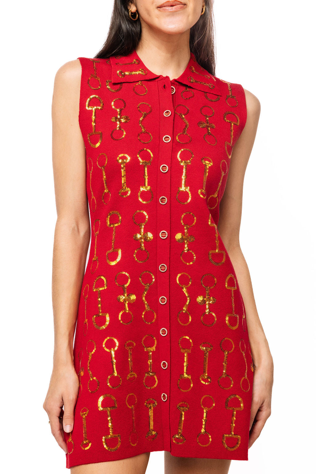 Red & Gold Horse Bit Button Up Knit Sleeveless Collar Dress | Queen Of Sparkles