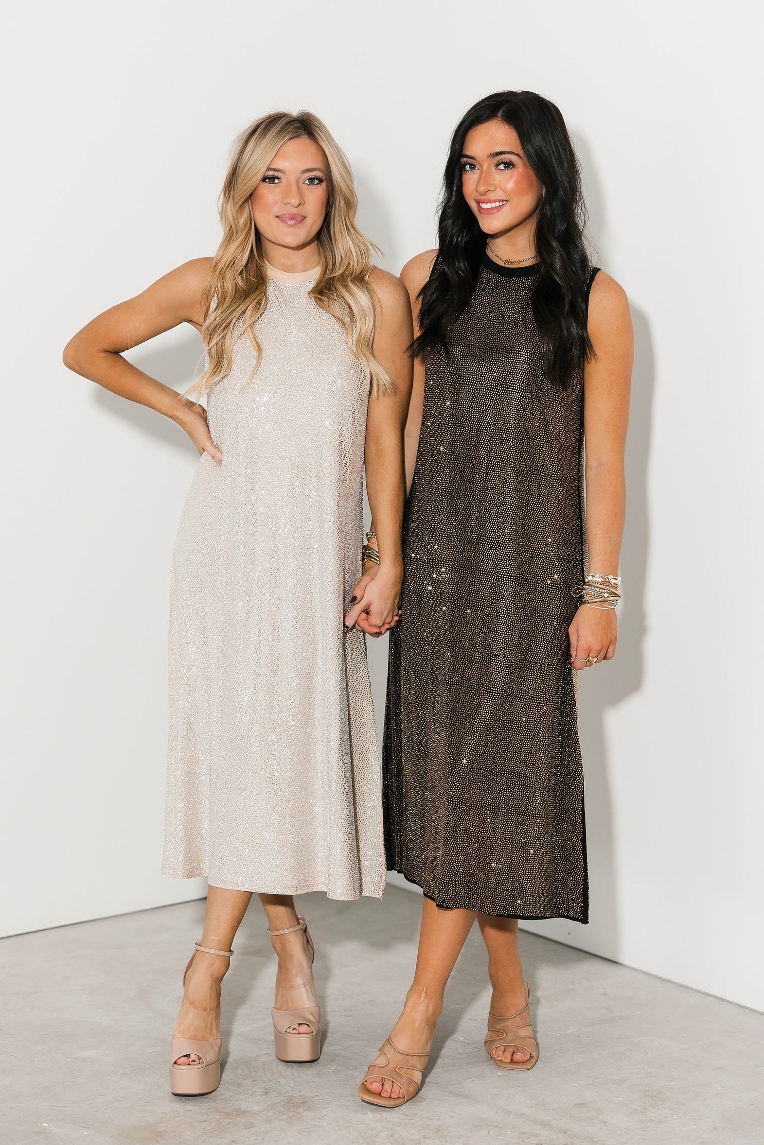 Beige Full Rhinestone Active Midi Dress | Queen Of Sparkles