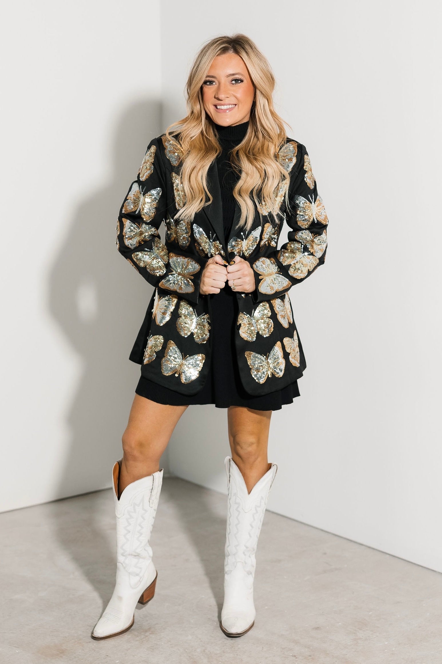 Black & Gold Sequin Butterfly Blazer | Queen Of Sparkles