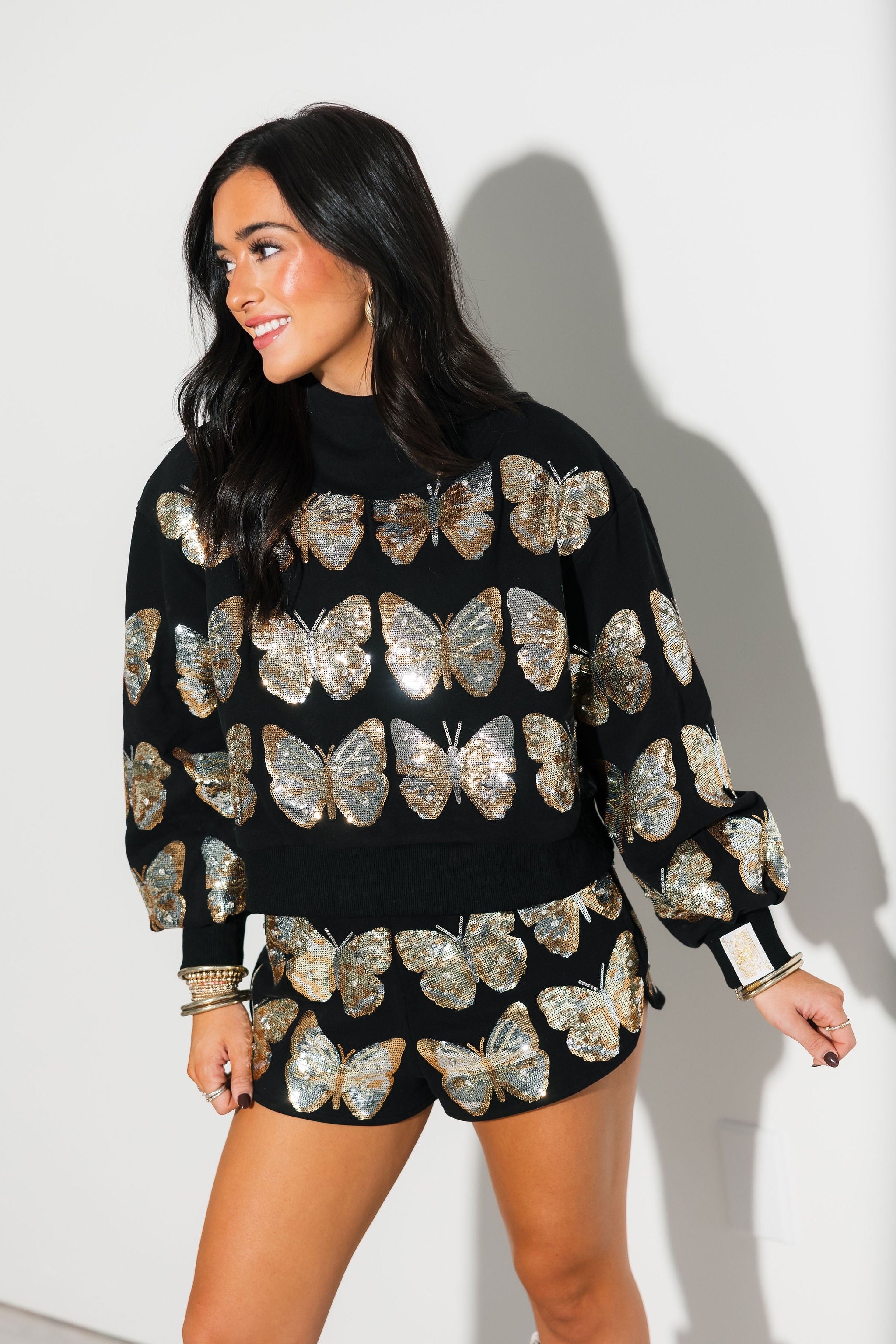 Black & Gold Sequin Butterfly Mockneck Sweatshirt | Queen Of Sparkles