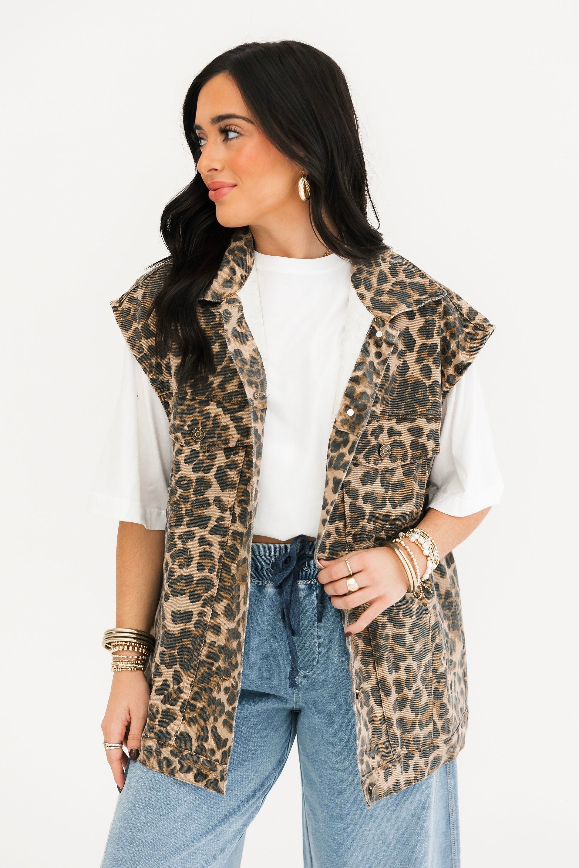 Denim Button Up Vest | Leopard