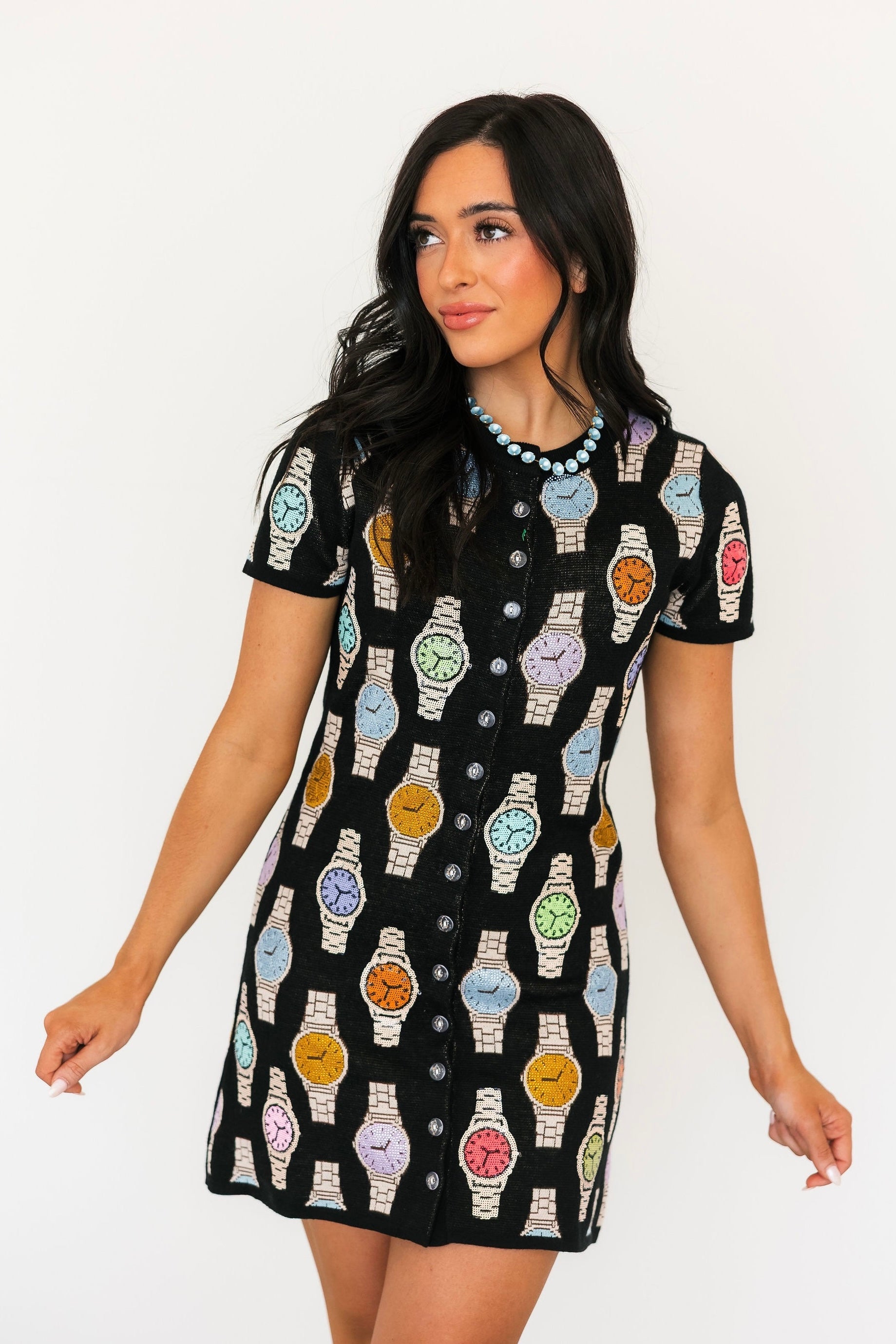Black Button Up Multi Watch Knit Short Sleeve Dress | Queen Of Sparkles