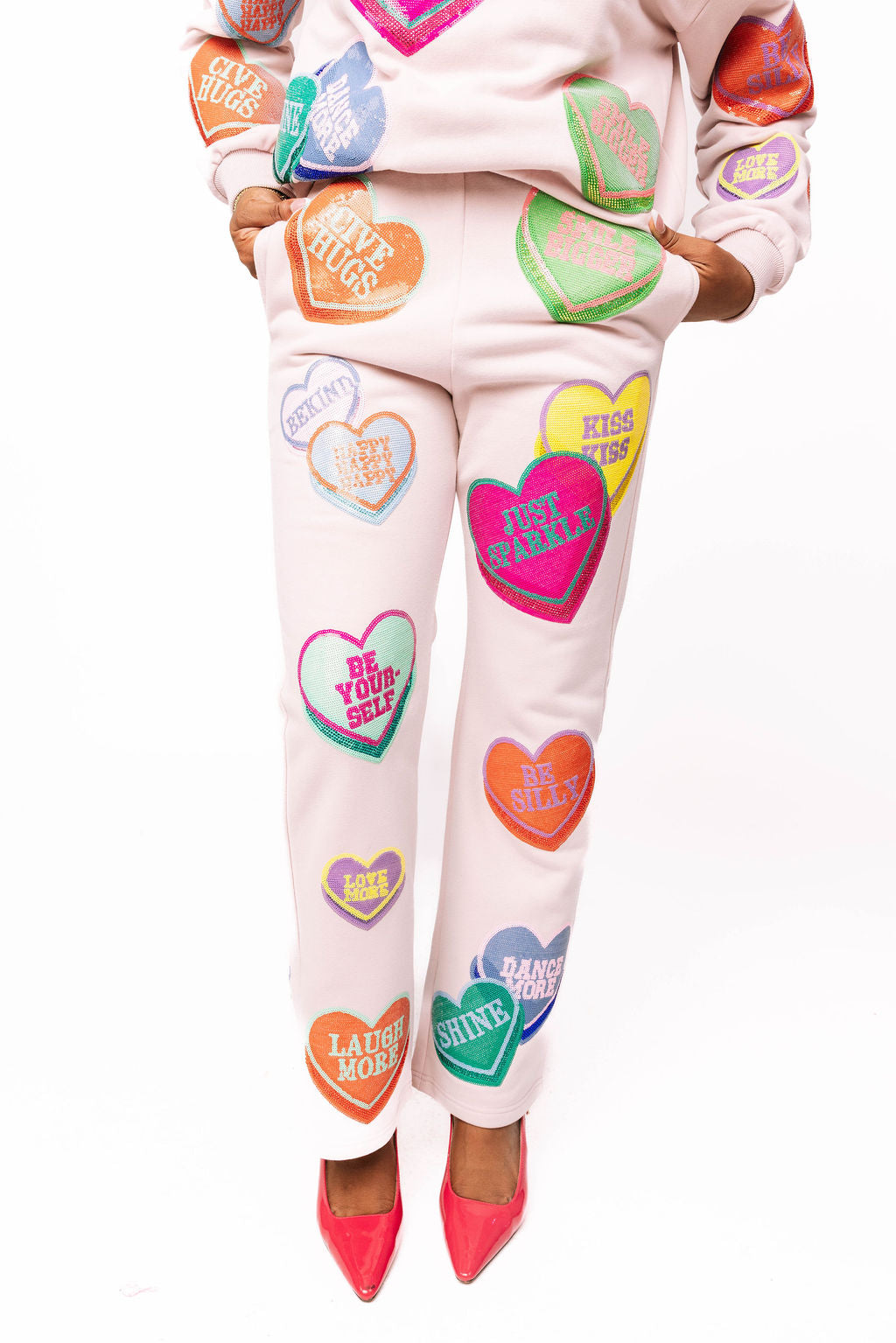 Pale Pink Multi Positive Hearts Sweatpant | Queen Of Sparkles