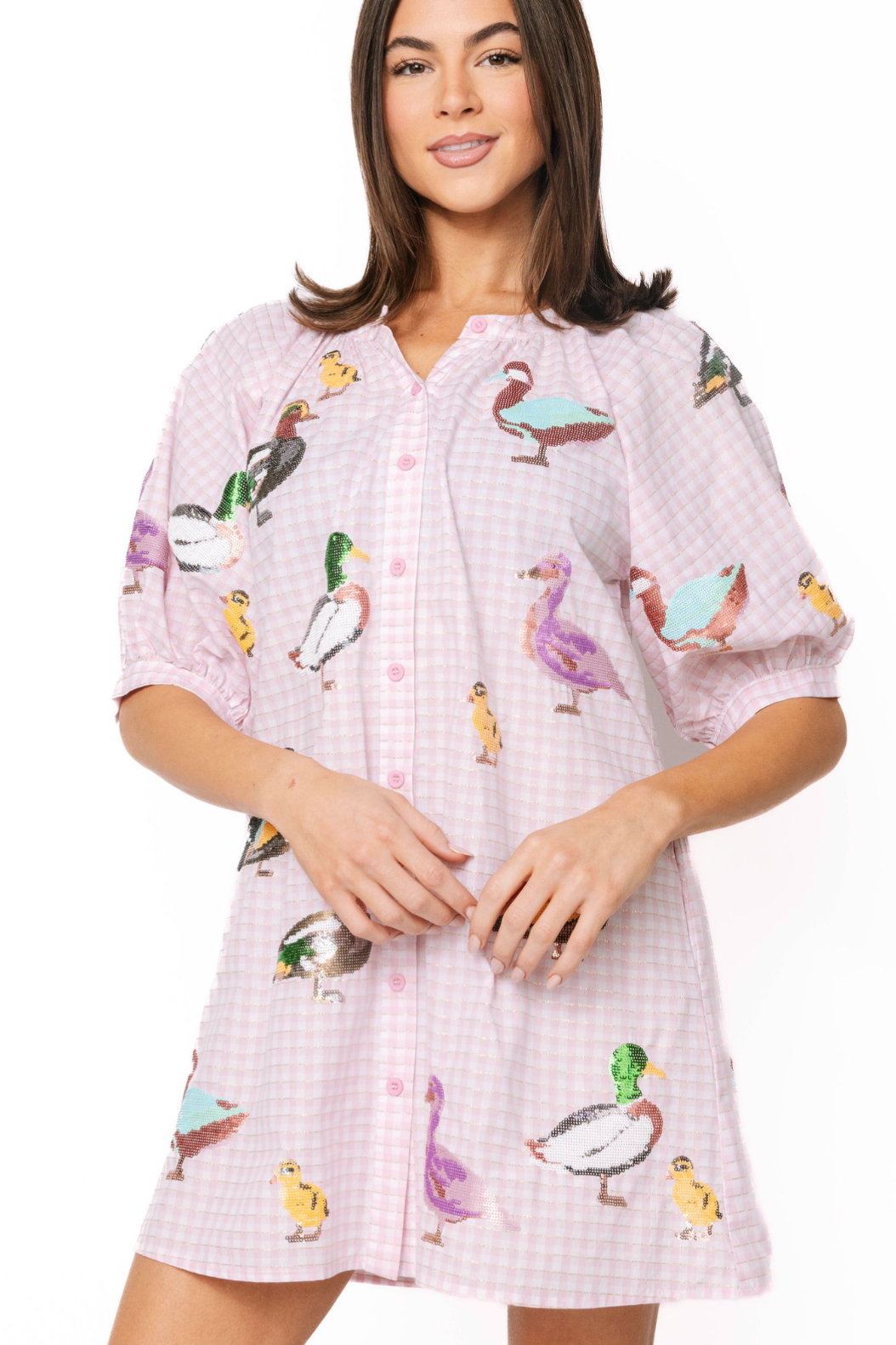 Light Pink Gingham Scattered Duck Button Up Cotton Dress | Queen Of Sparkles