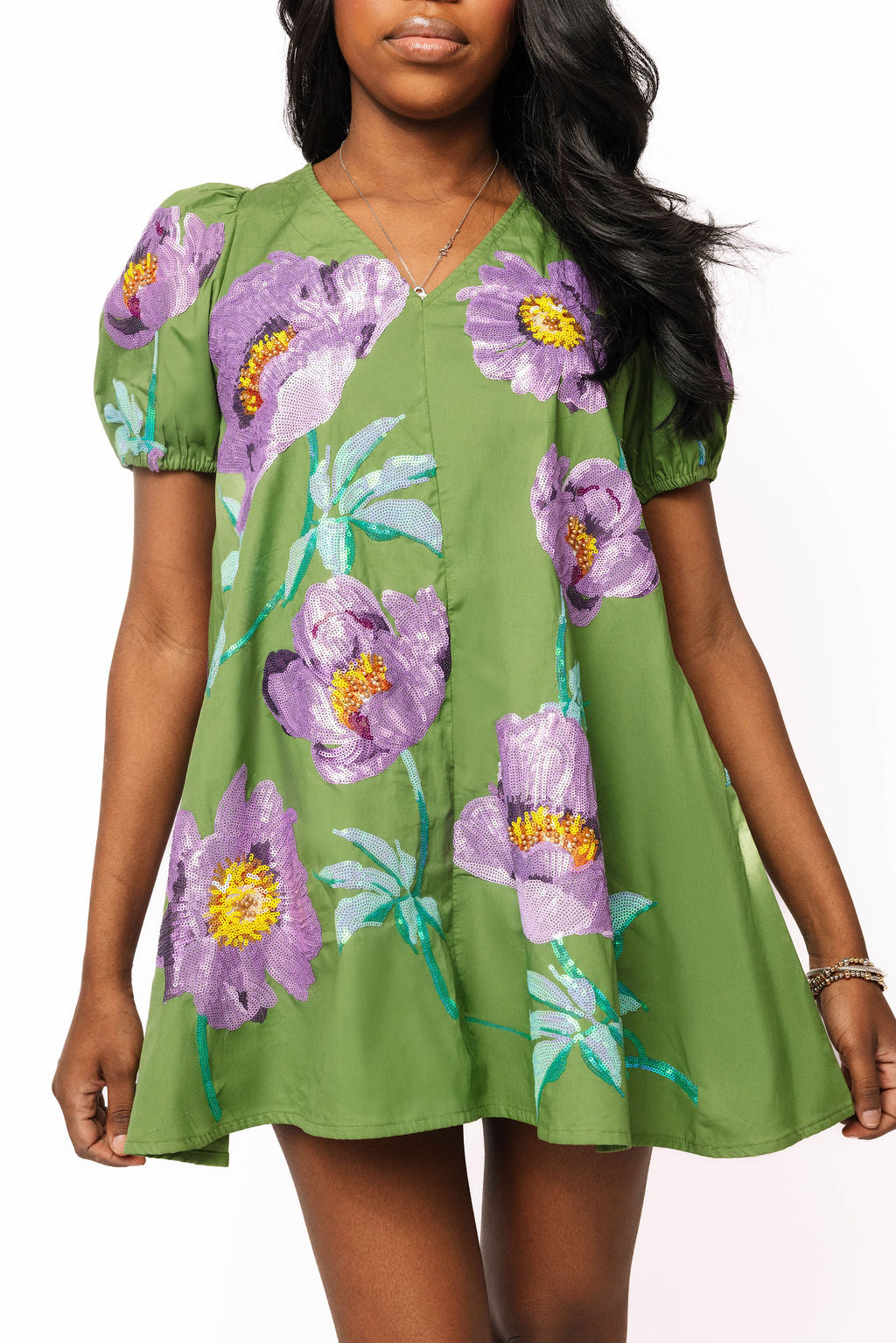 Green & Purple Poof Sleeve Flower Cotton Dress | Queen Of Sparkles