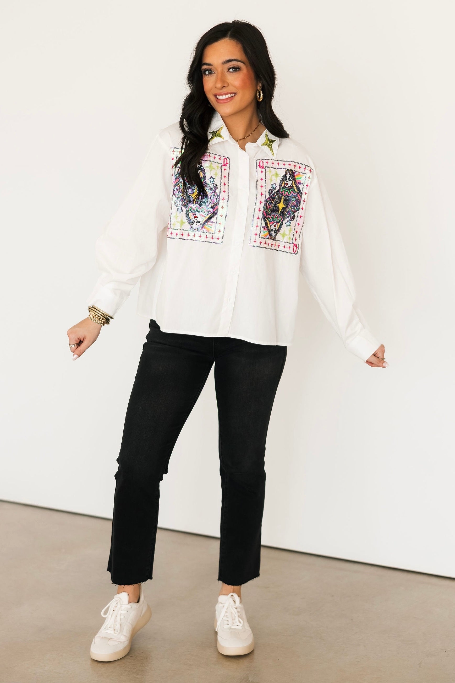 White Queen Card & Sparkle Collar Button Up Cotton Top | Queen Of Sparkles