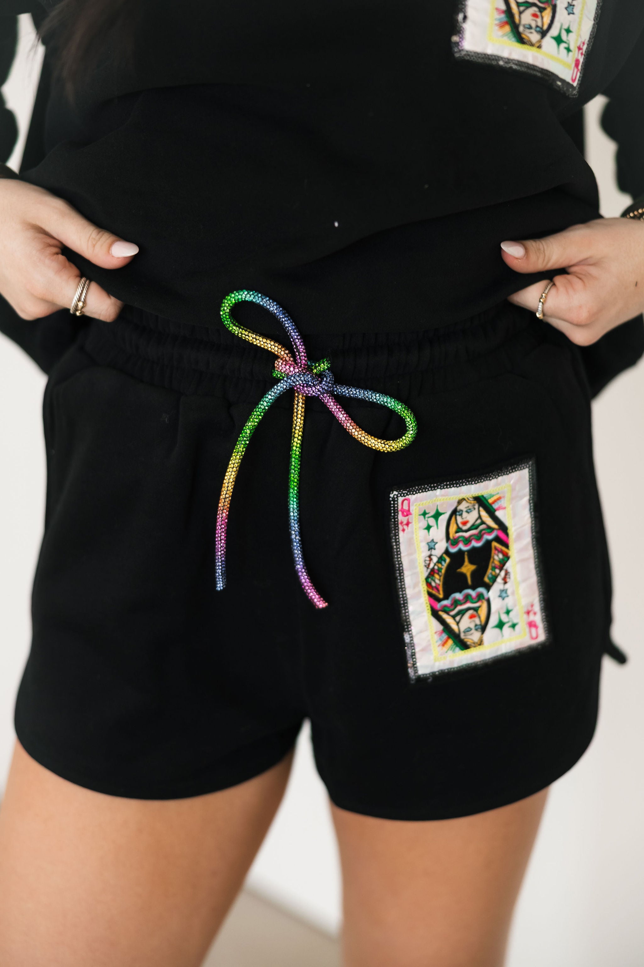 Black QOS Queen Card Rhinestone Tie Short | Queen Of Sparkles