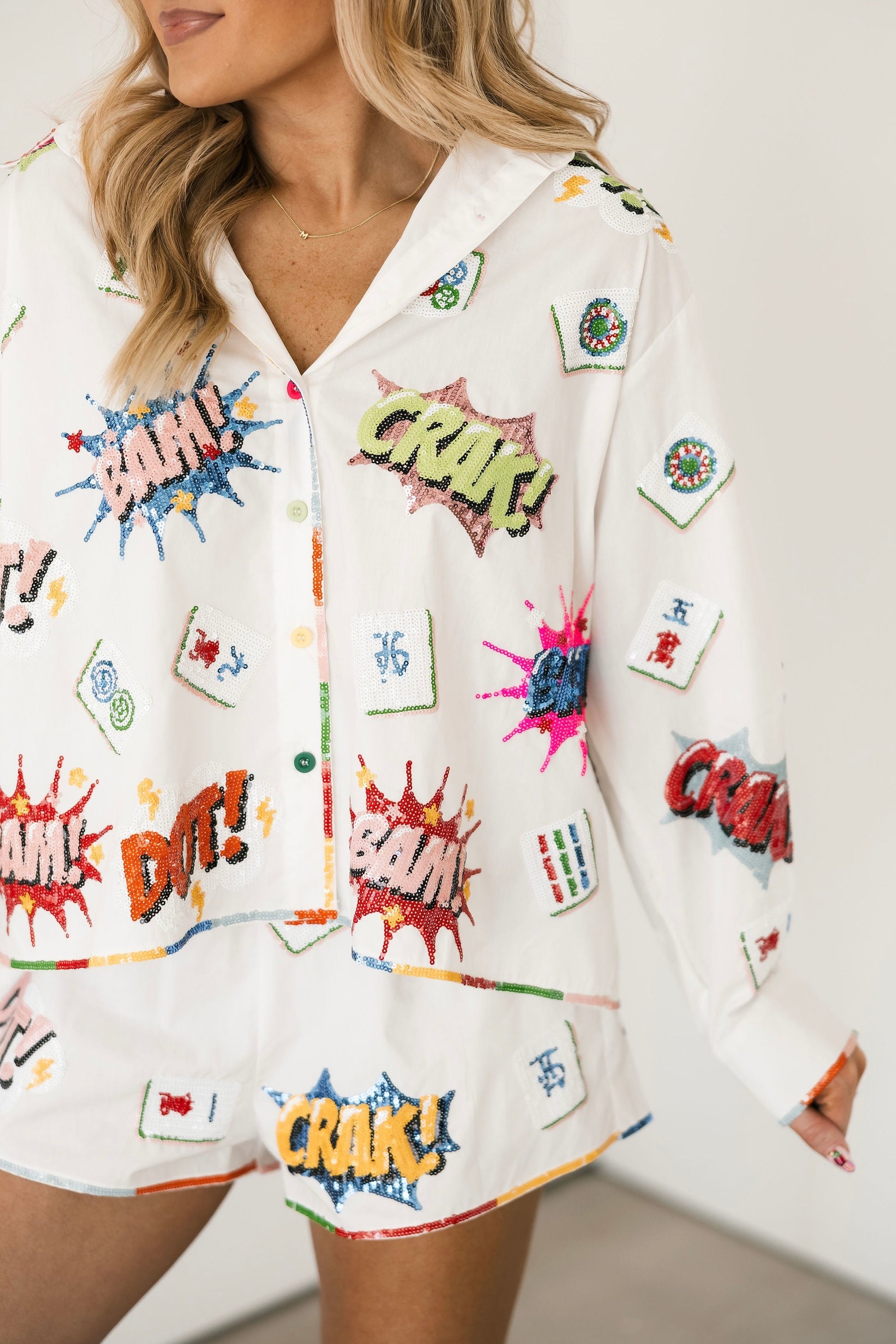 White Mahjong Icon Rainbow Trim Collar Top | Queen Of Sparkles