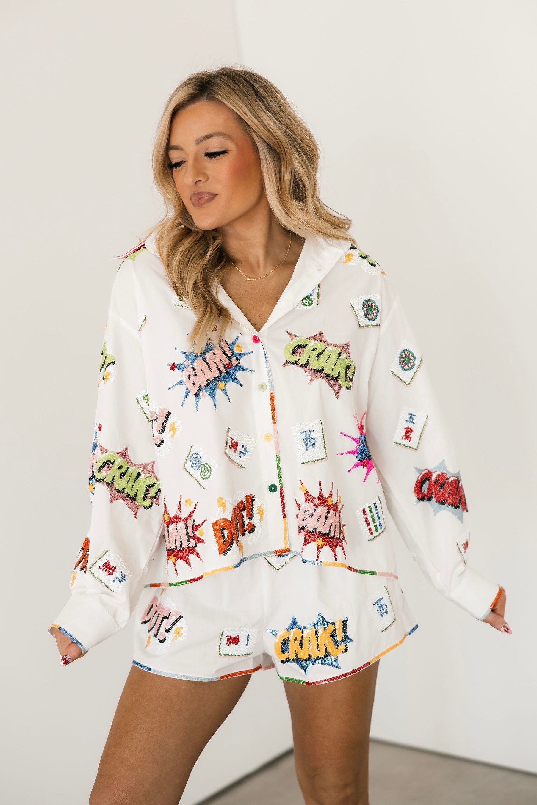 White Mahjong Icon Rainbow Trim Short | Queen Of Sparkles