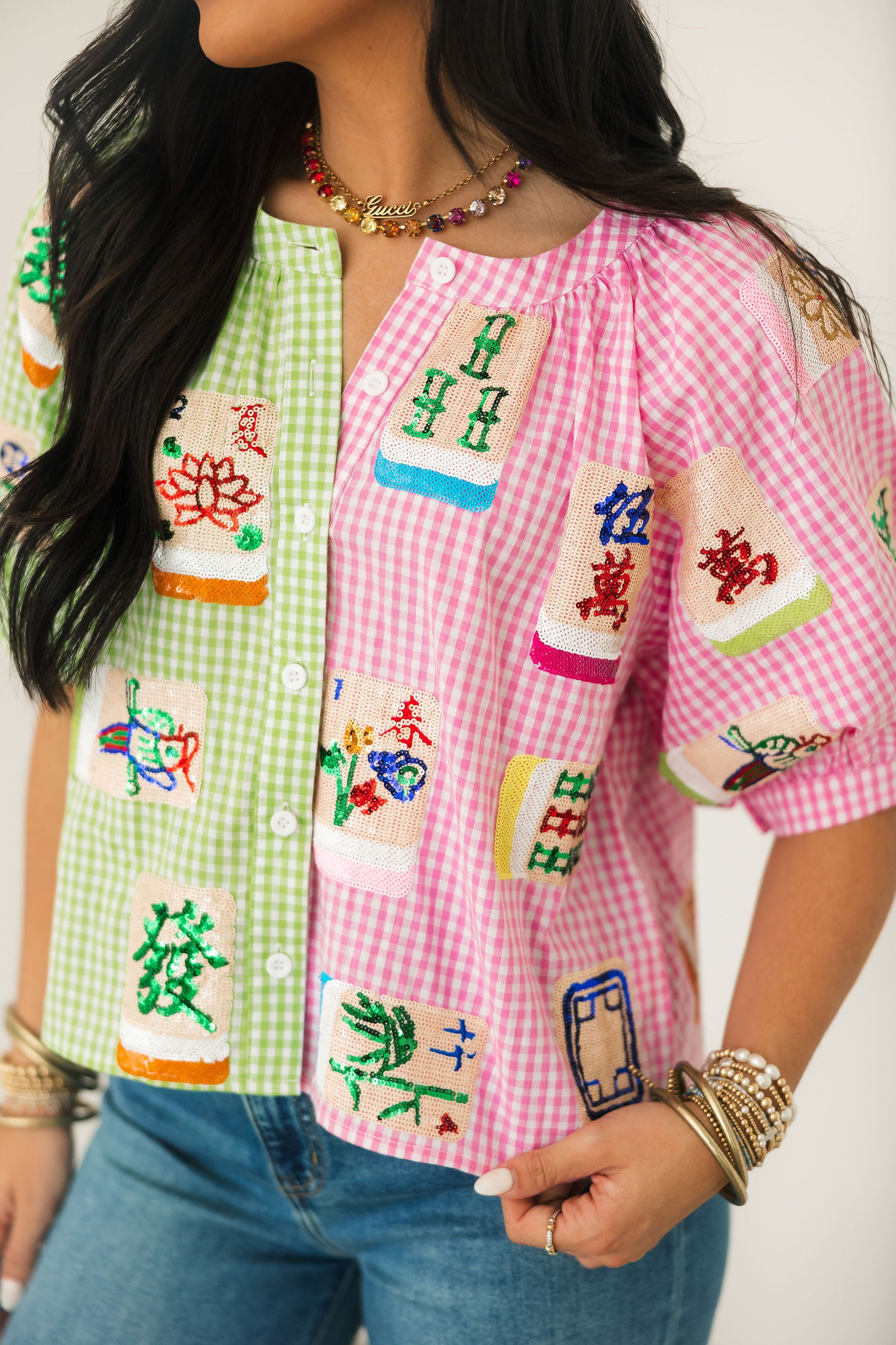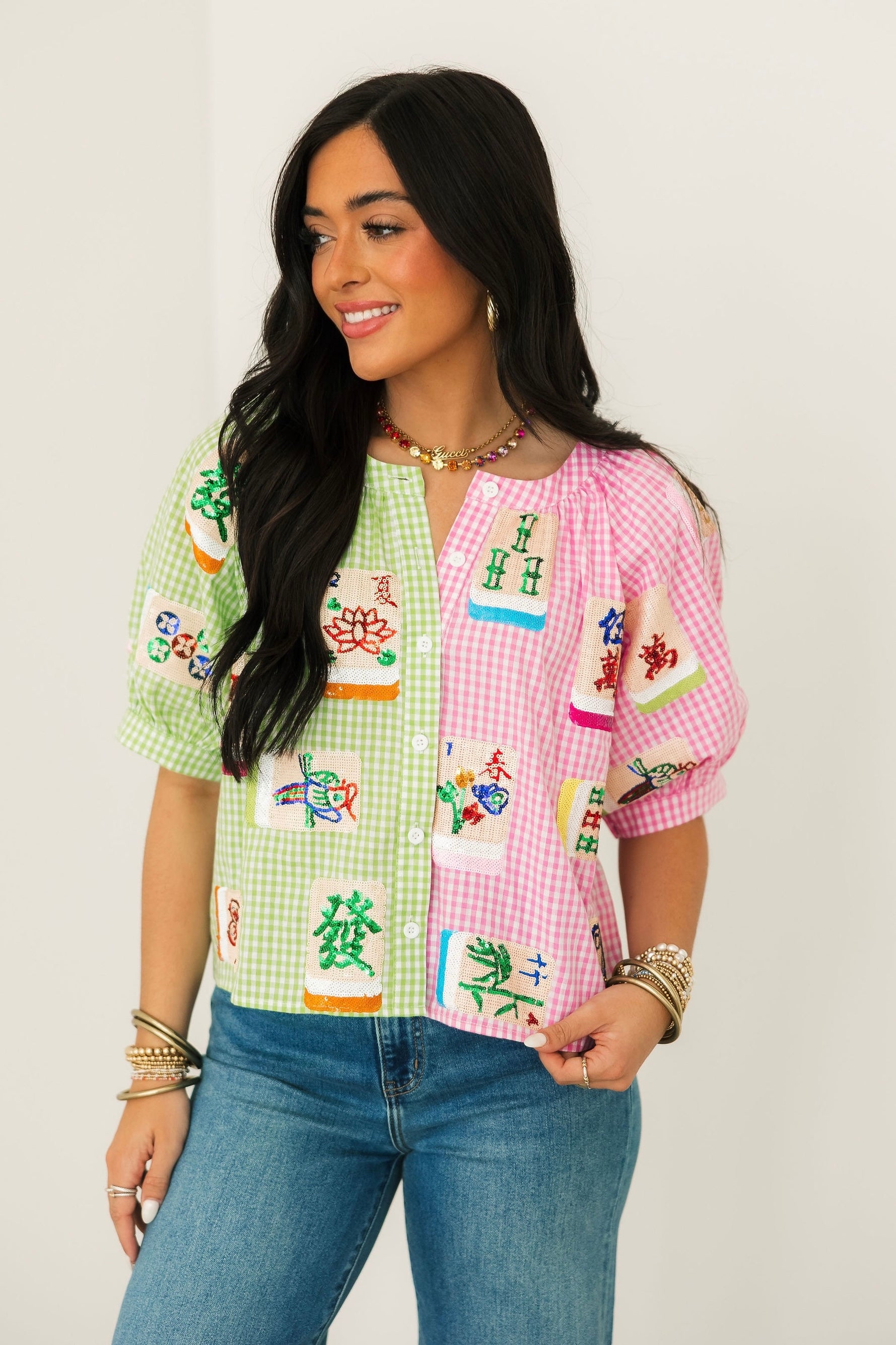 Colorblock Gingham Mahjong Tile Button Up Top | Queen Of Sparkles