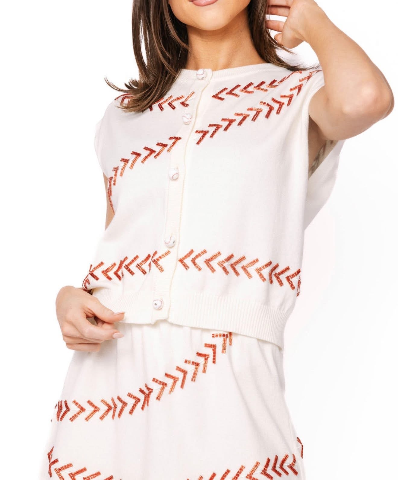White & Red Beaded Baseball Stitch Button Up Vest | Queen Of Sparkles