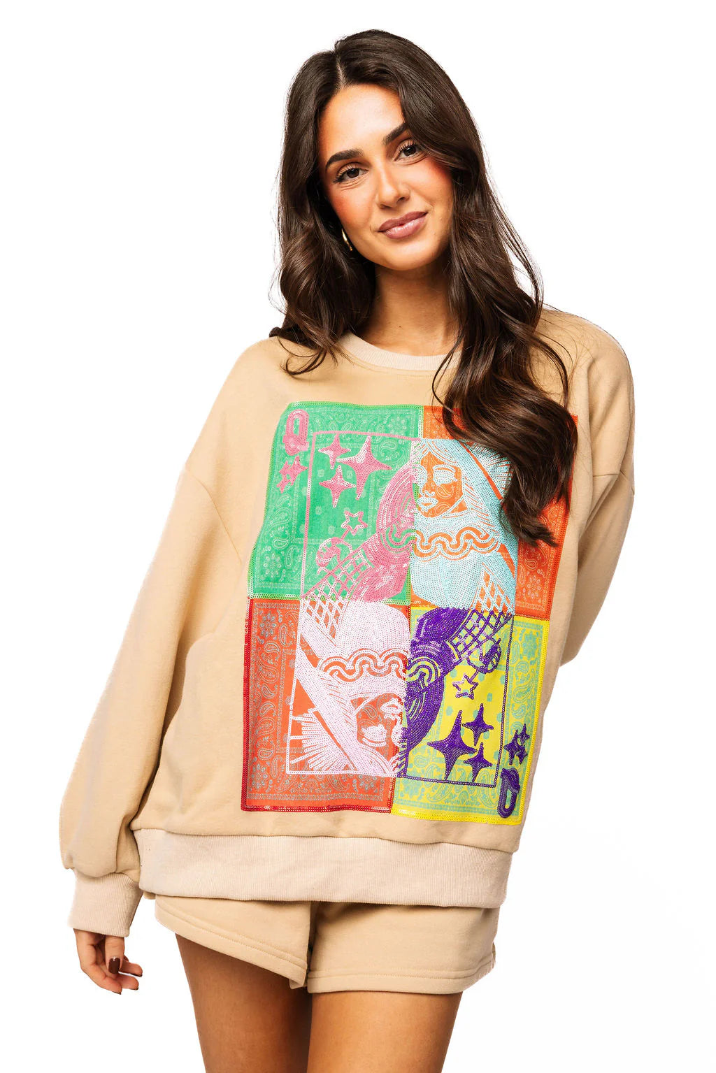 Beige Colorblock Bandana QOS Card Logo Sweatshirt | Queen Of Sparkles