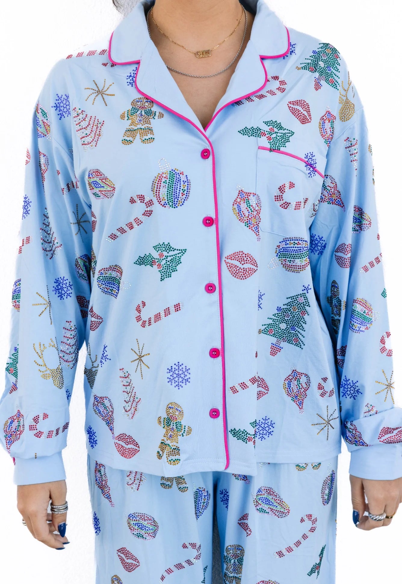 Light Blue Multi Christmas Icon Long Sleeve Pj Top | Queen Of Sparkles