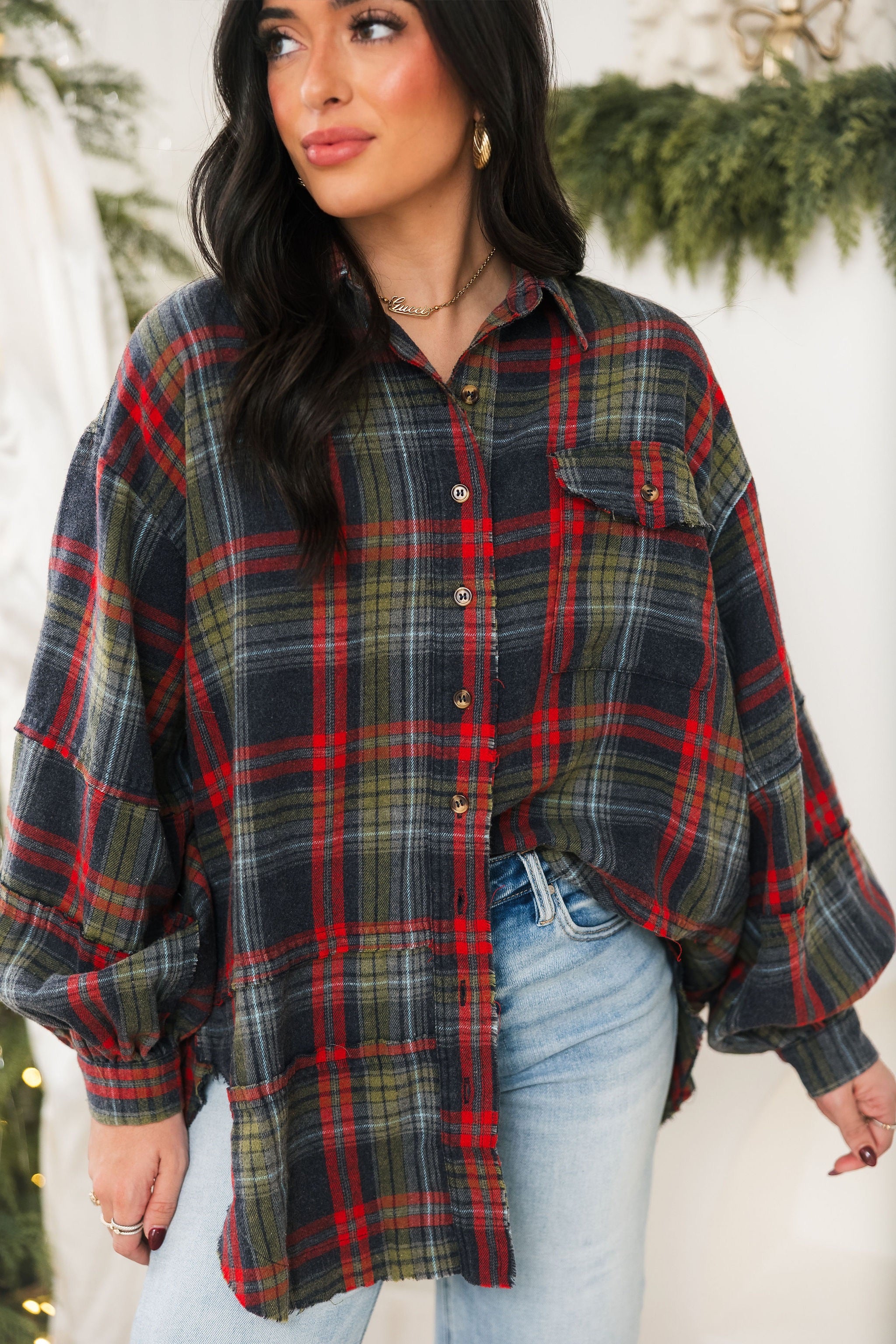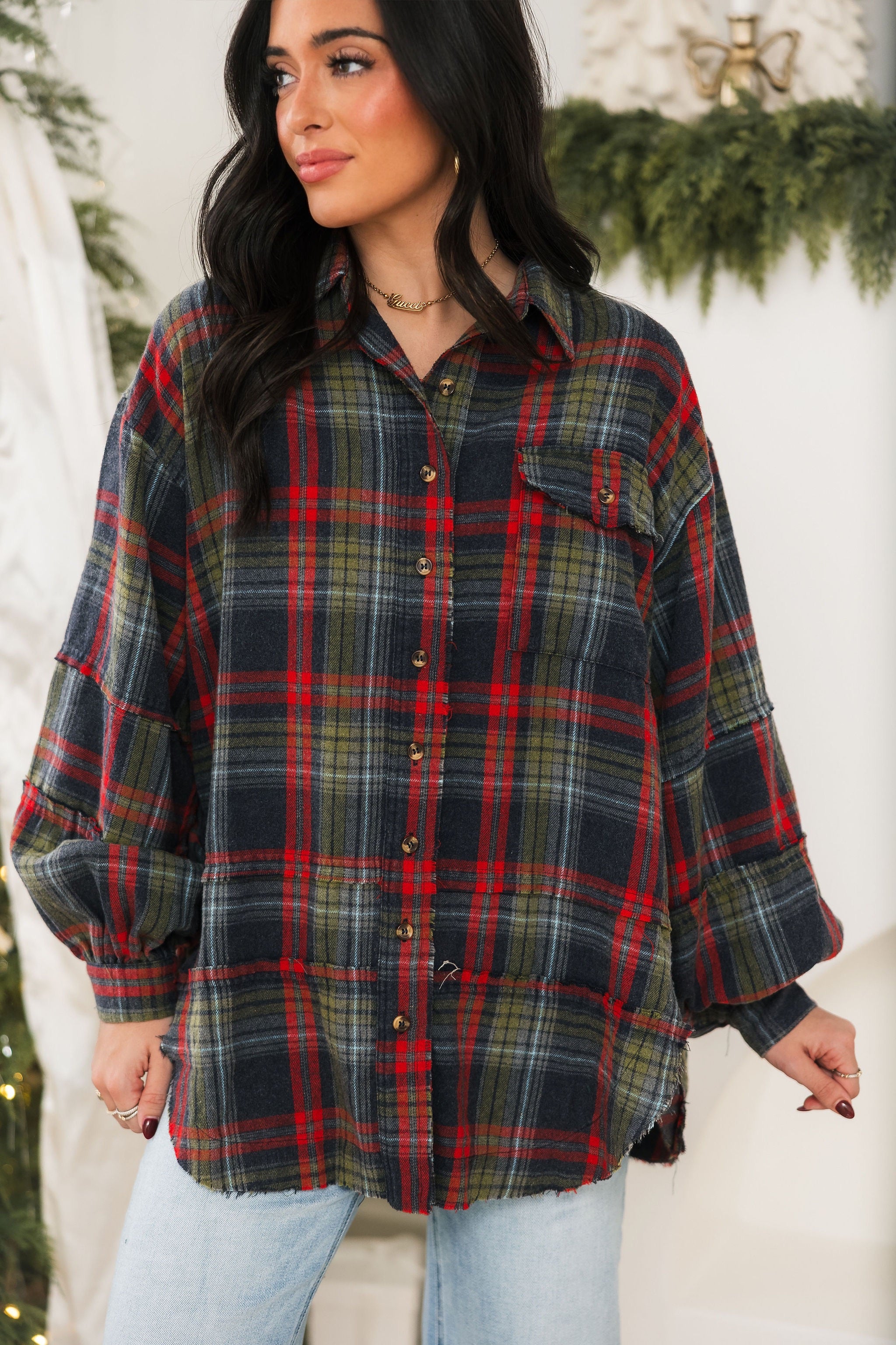 Pine & Plaid Puff Sleeve Top