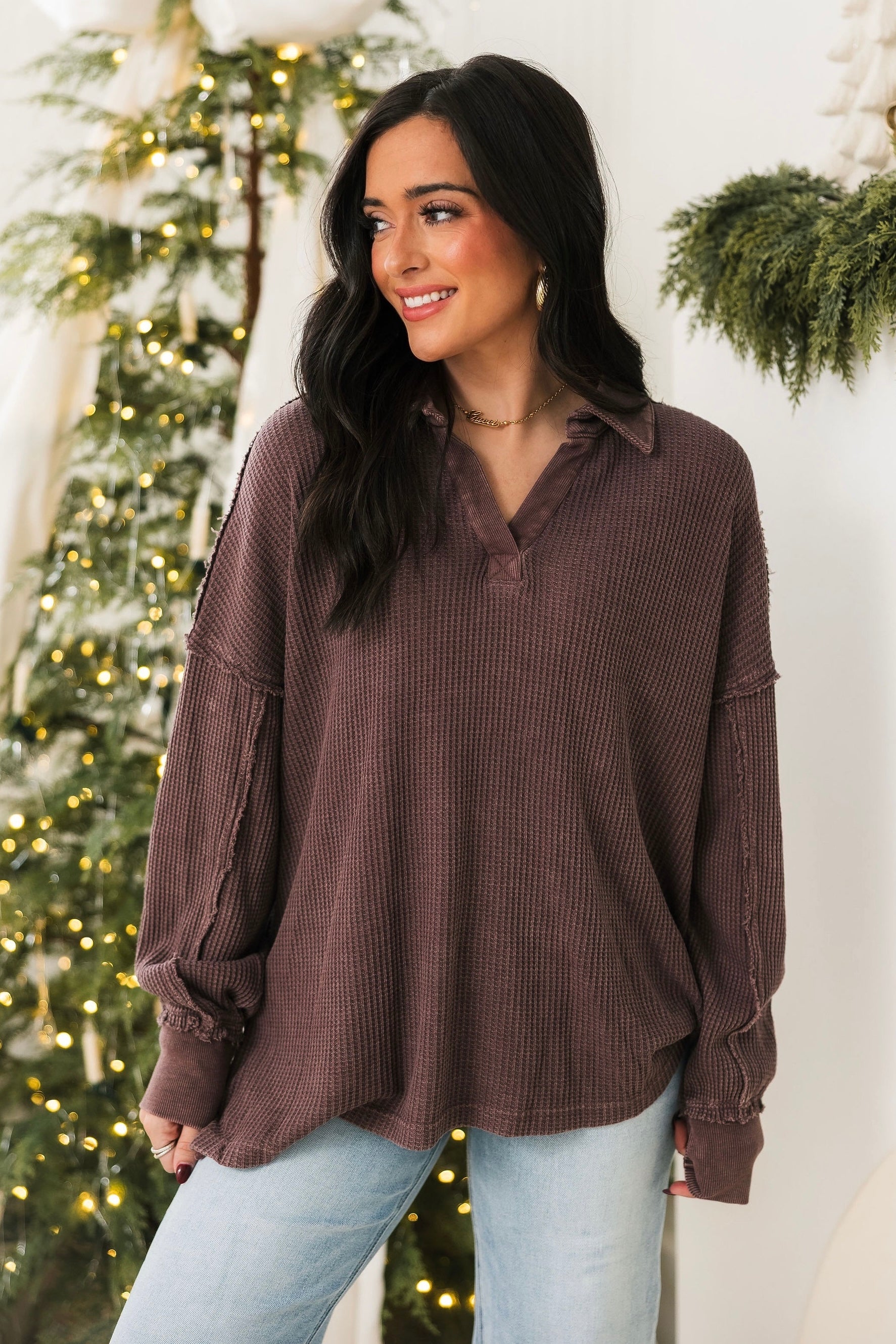 Waffle Knit V-Neck Pullover | Mauve