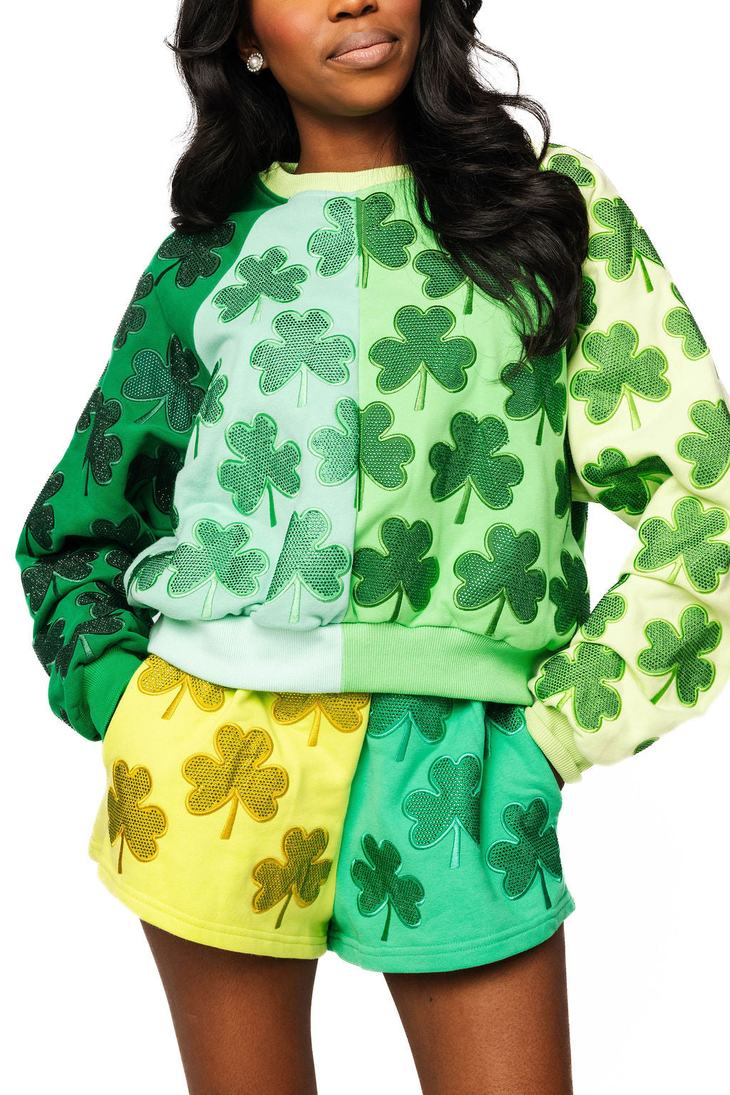 Green Colorblock Rhinestone Shamrock Short | Queen Of Sparkles