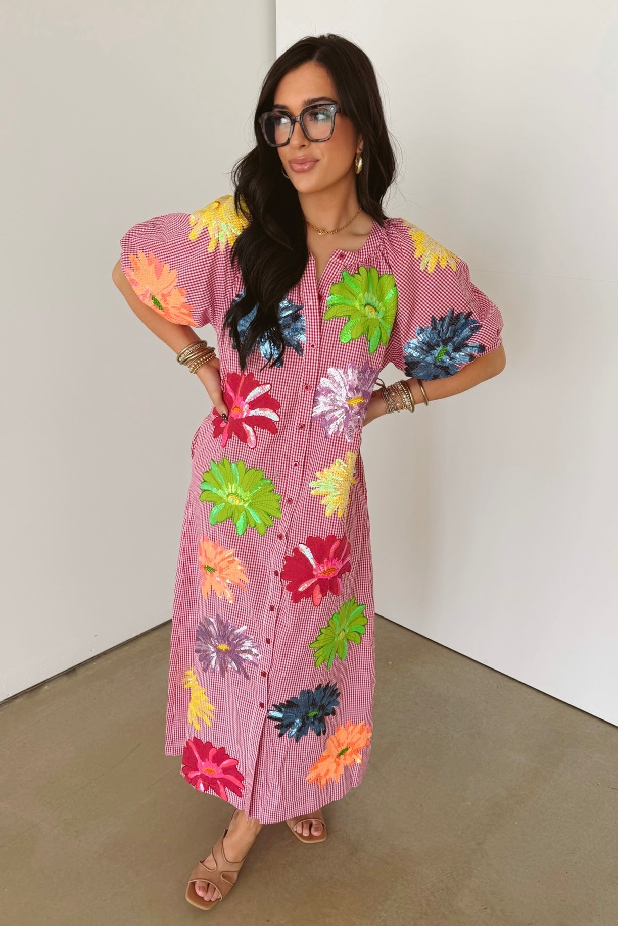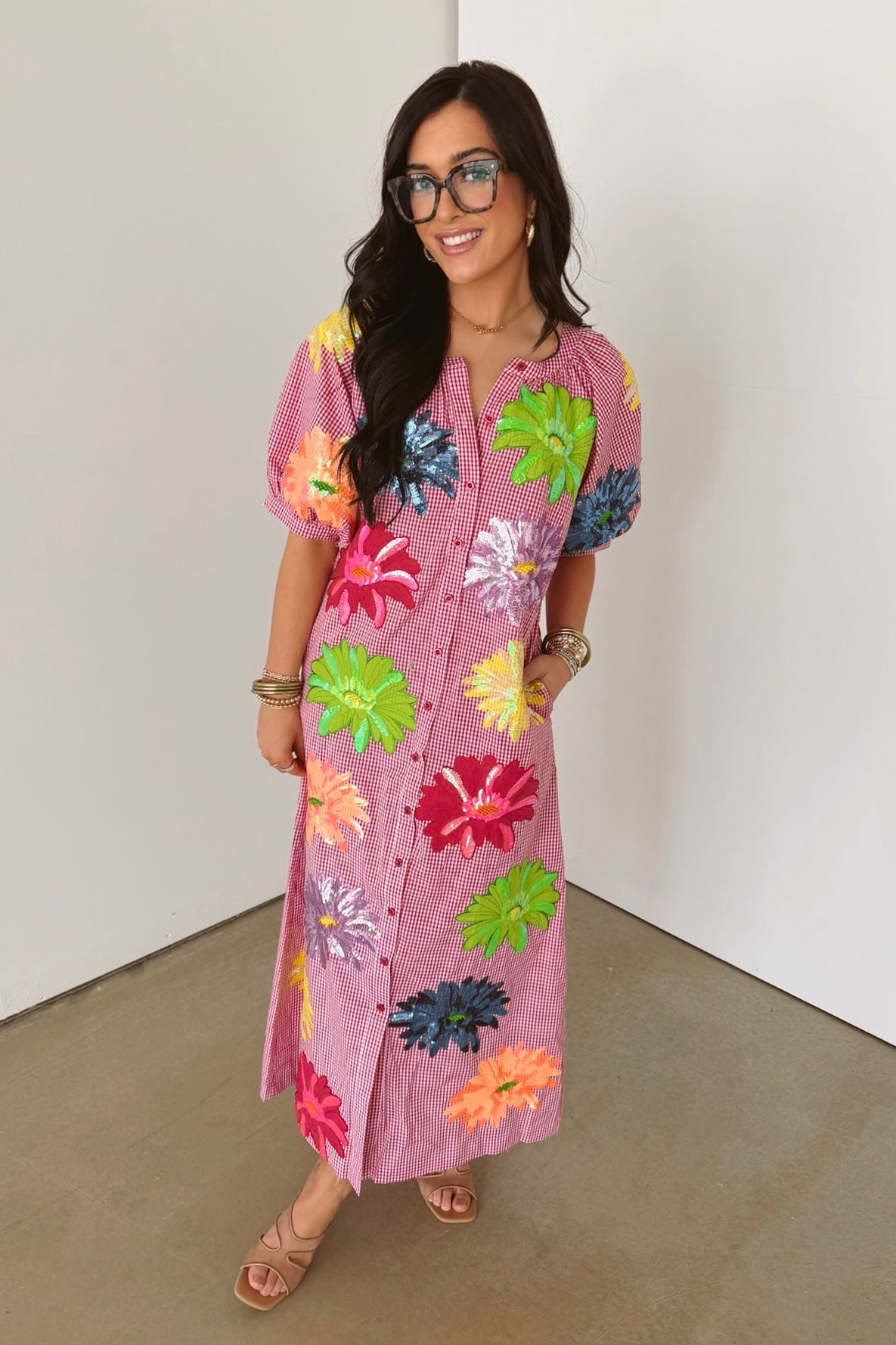 Pink Gingham Multi Flower Button Up Cotton Midi Dress | Queen Of Sparkles