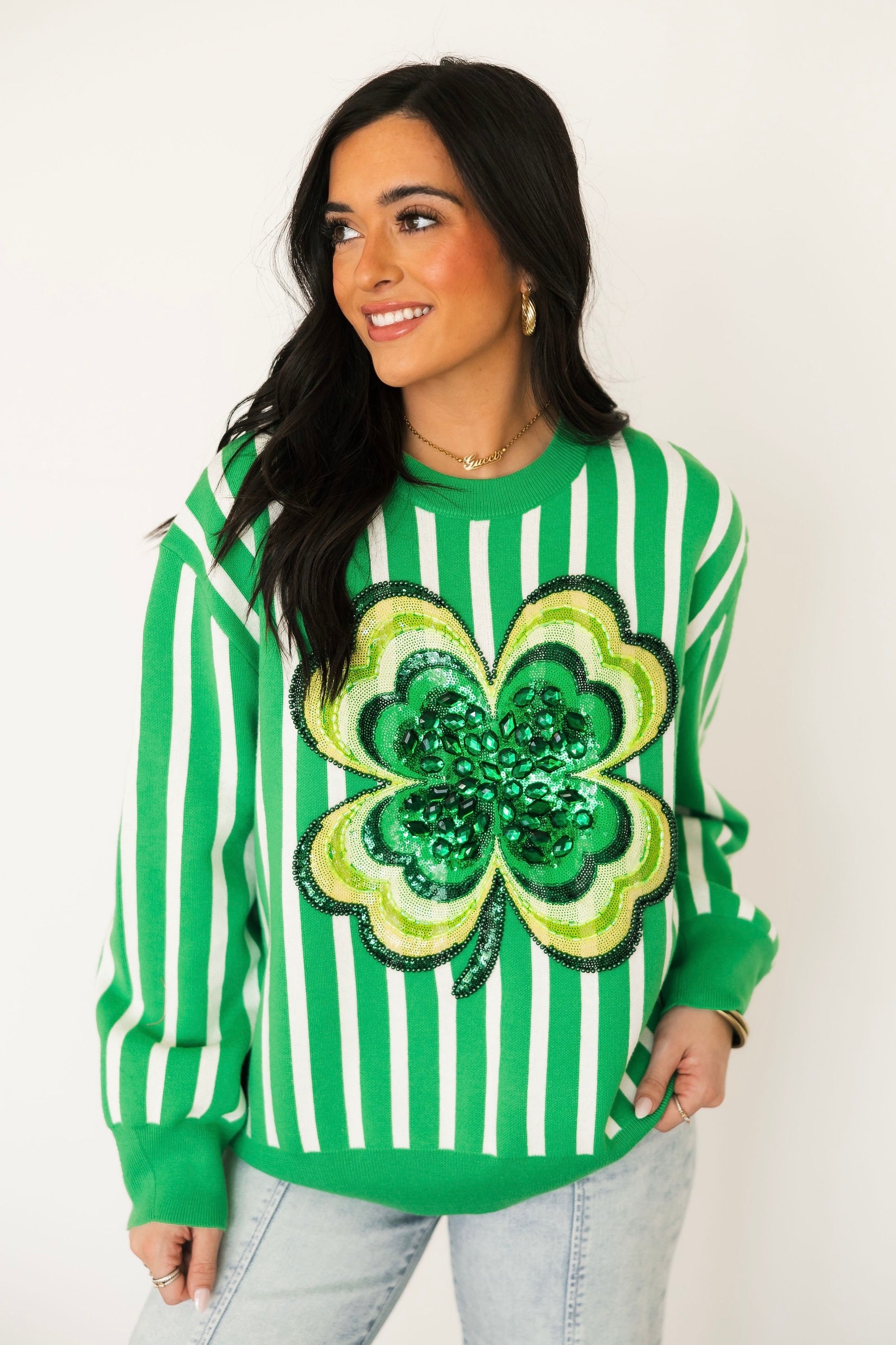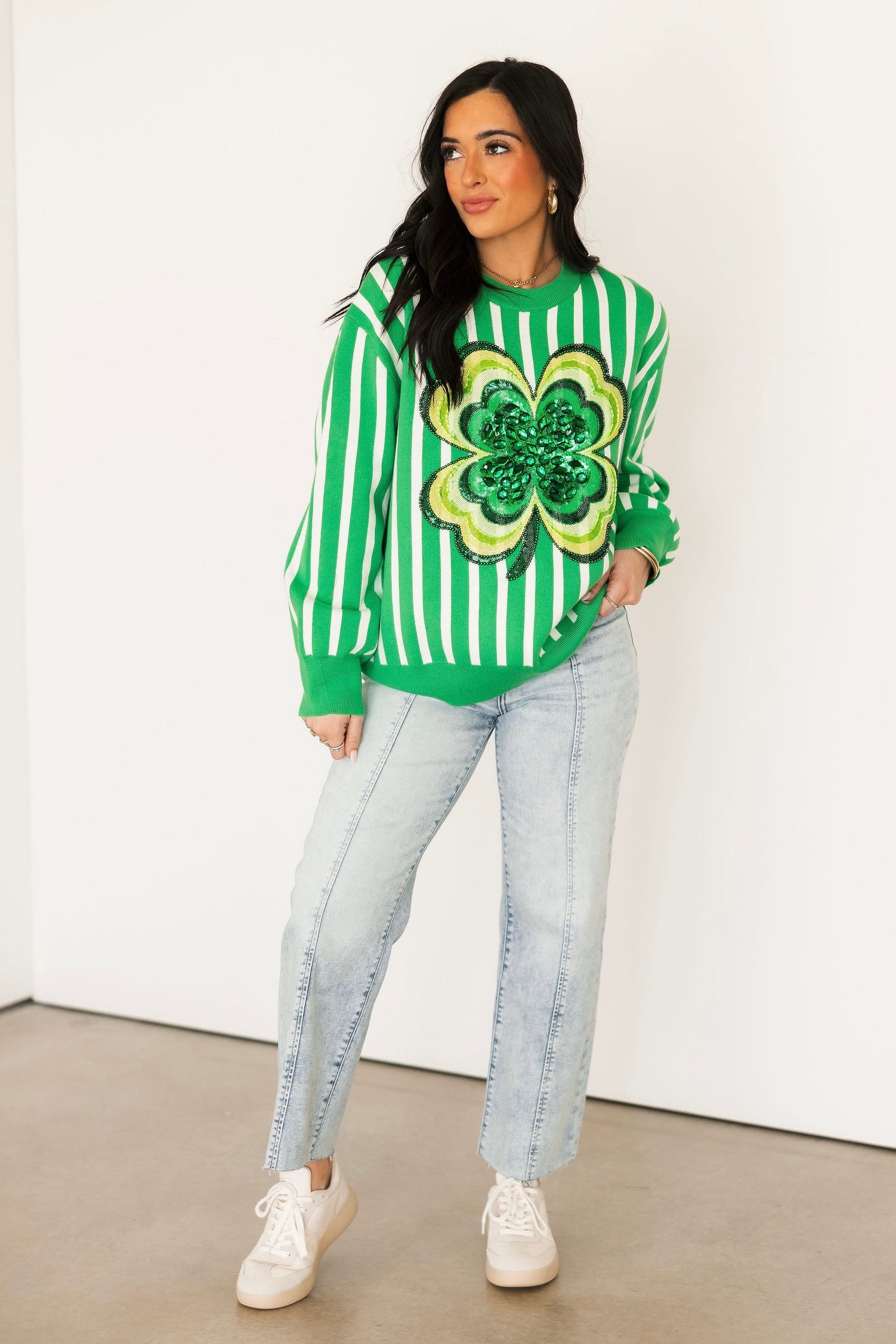 Green & White Stripe Shamrock Sweater | Queen Of Sparkles