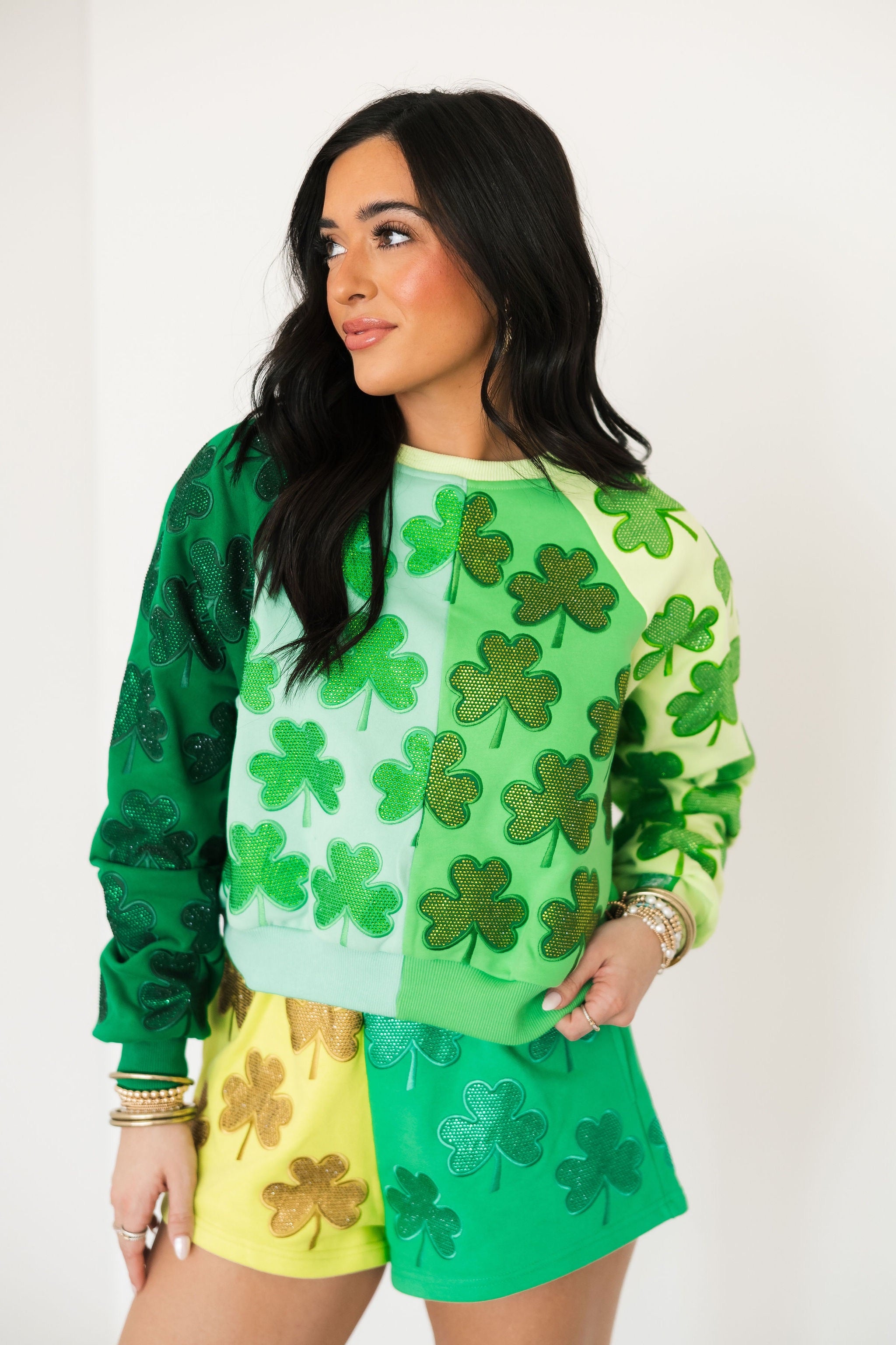 Green Colorblock Rhinestone Shamrock Short | Queen Of Sparkles