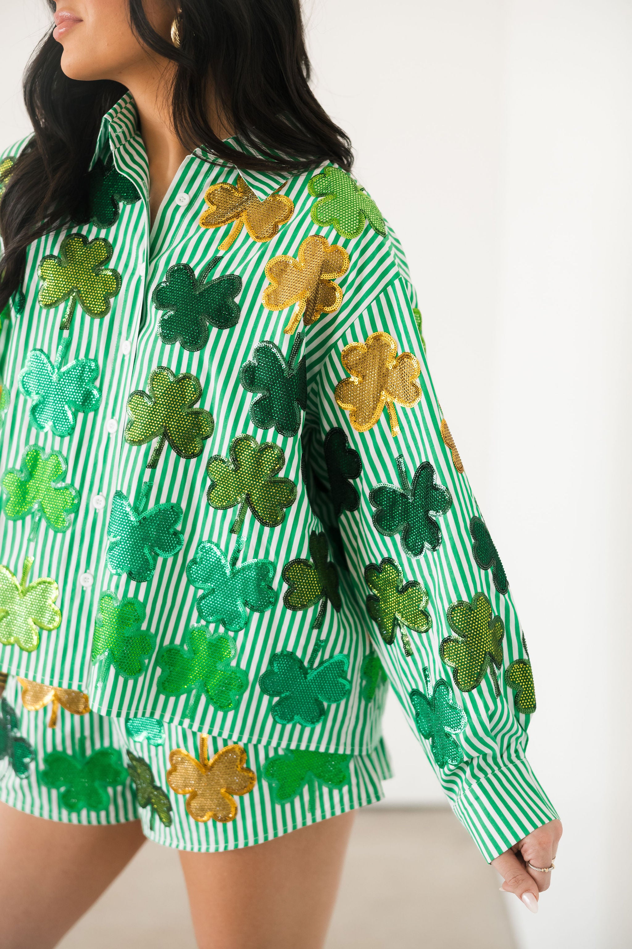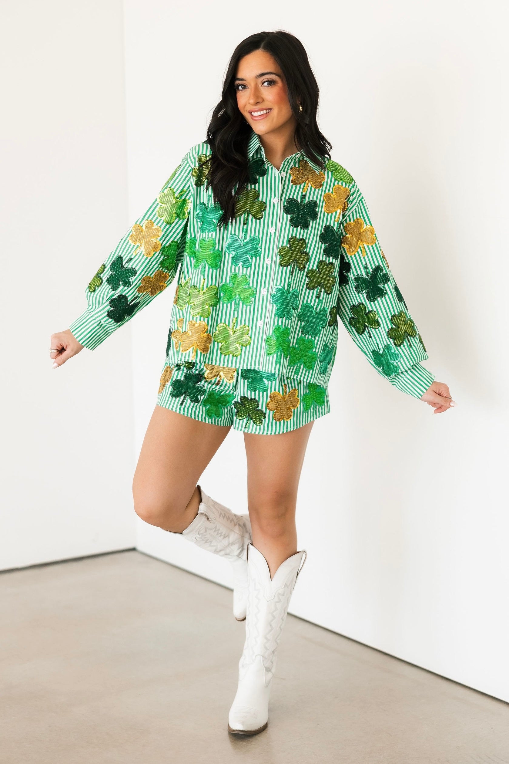 Green & White Striped Rhinestone Shamrock Button Up Long Sleeve Top | Queen Of Sparkles