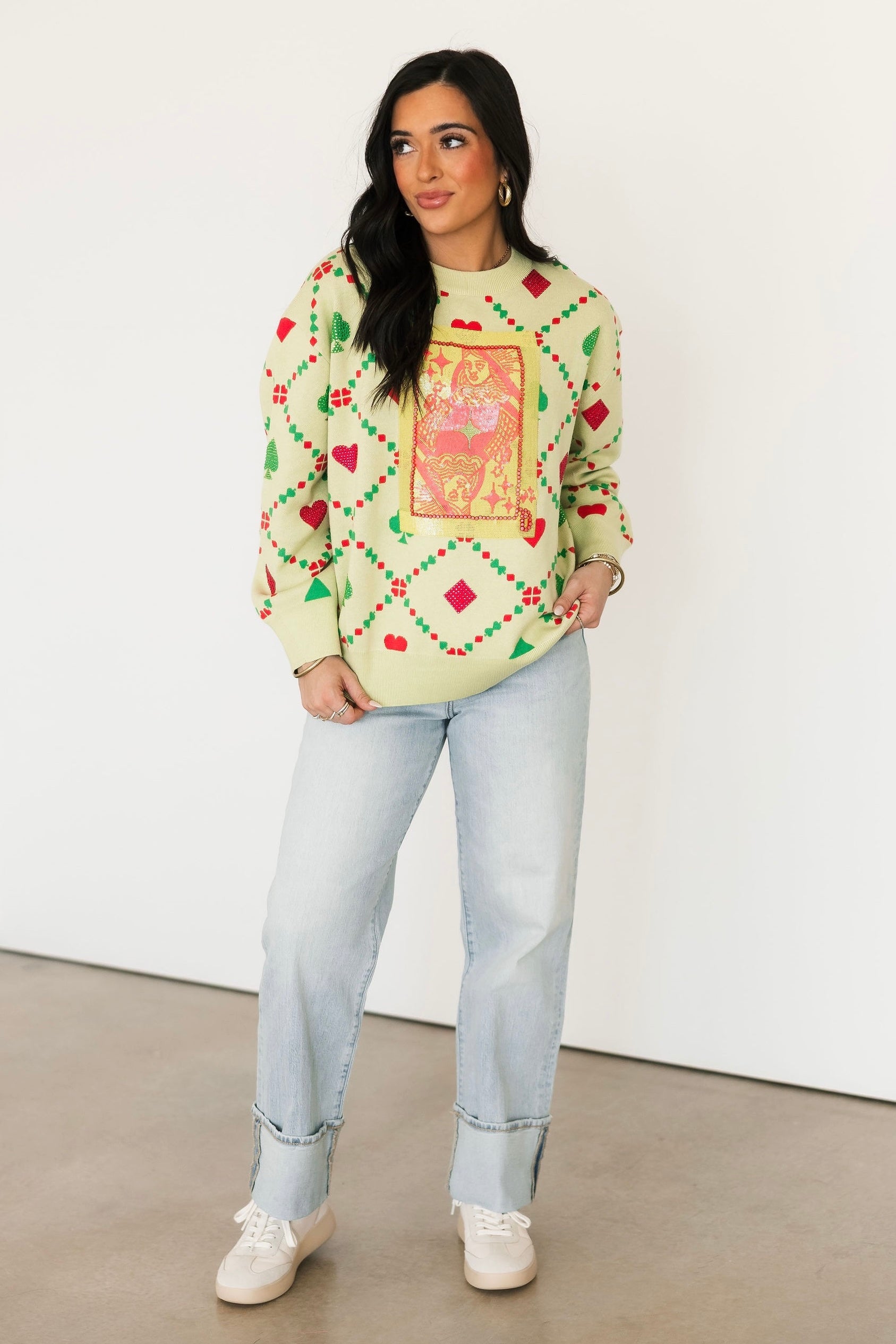 Light Green Multi QOS Card Logo & Suits Sweater | Queen Of Sparkles