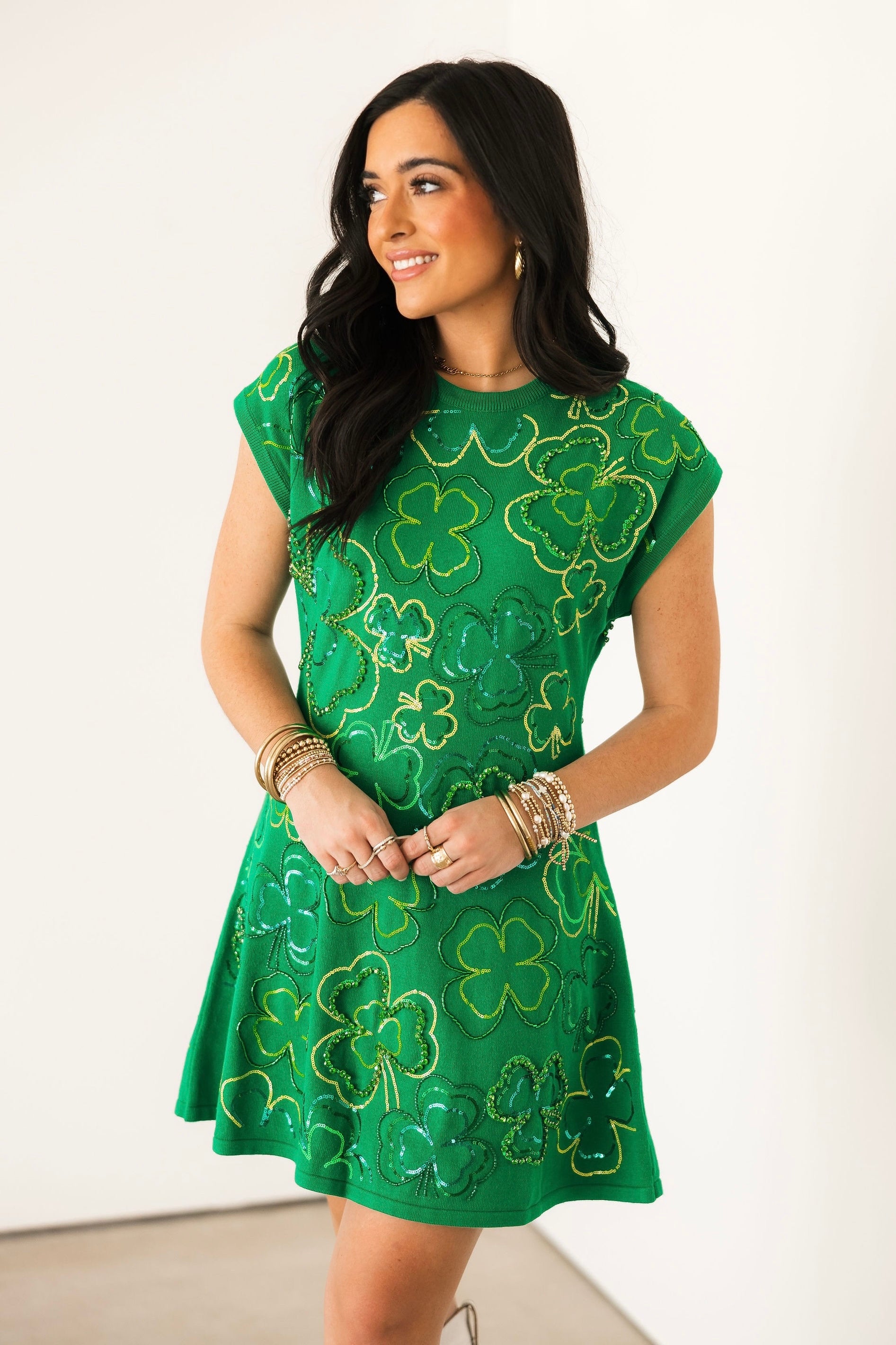 Green Groovy Shamrock Short Sleeve Knit Dress | Queen Of Sparkles