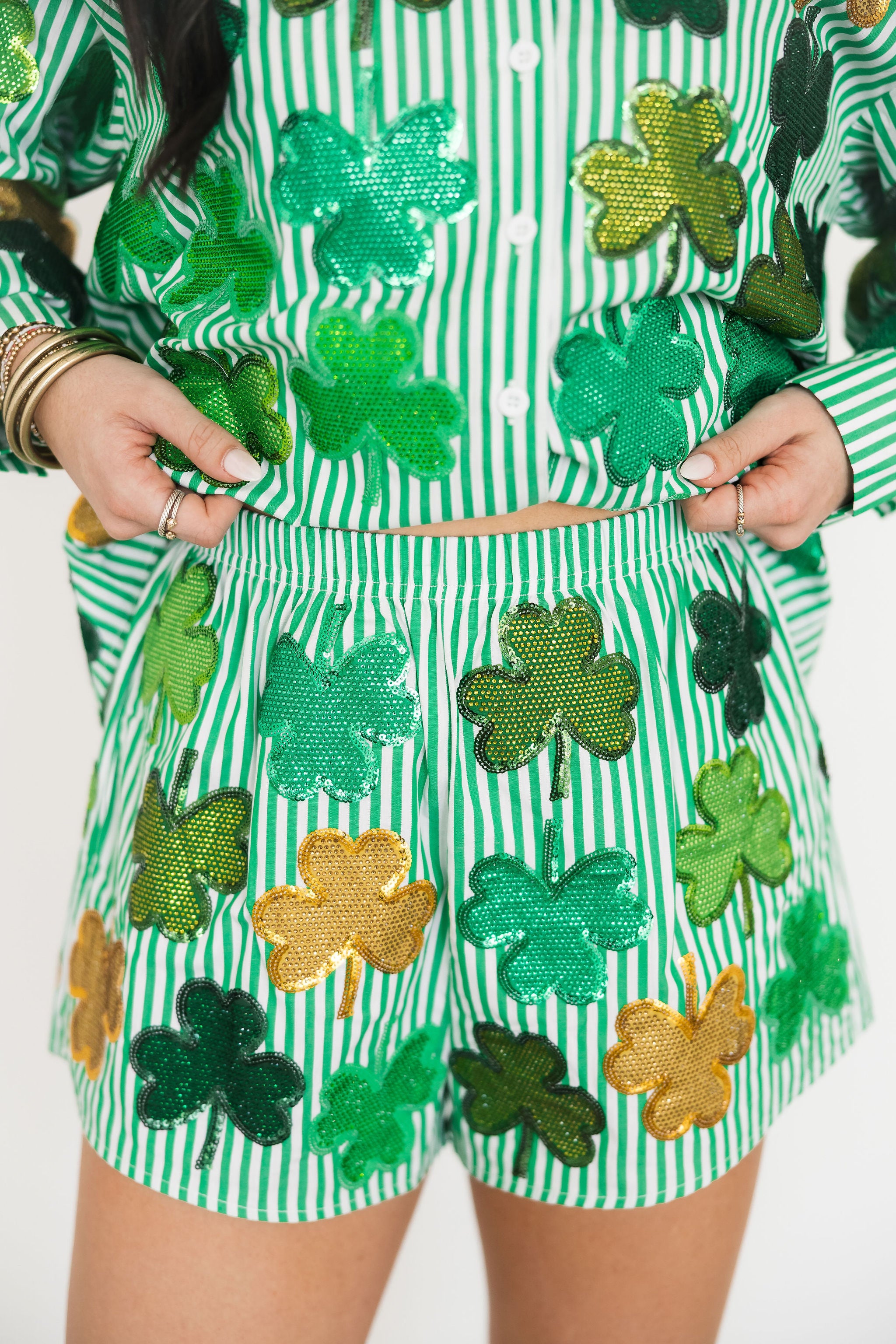 Green & White Striped Rhinestone Shamrock Short | Queen Of Sparkles