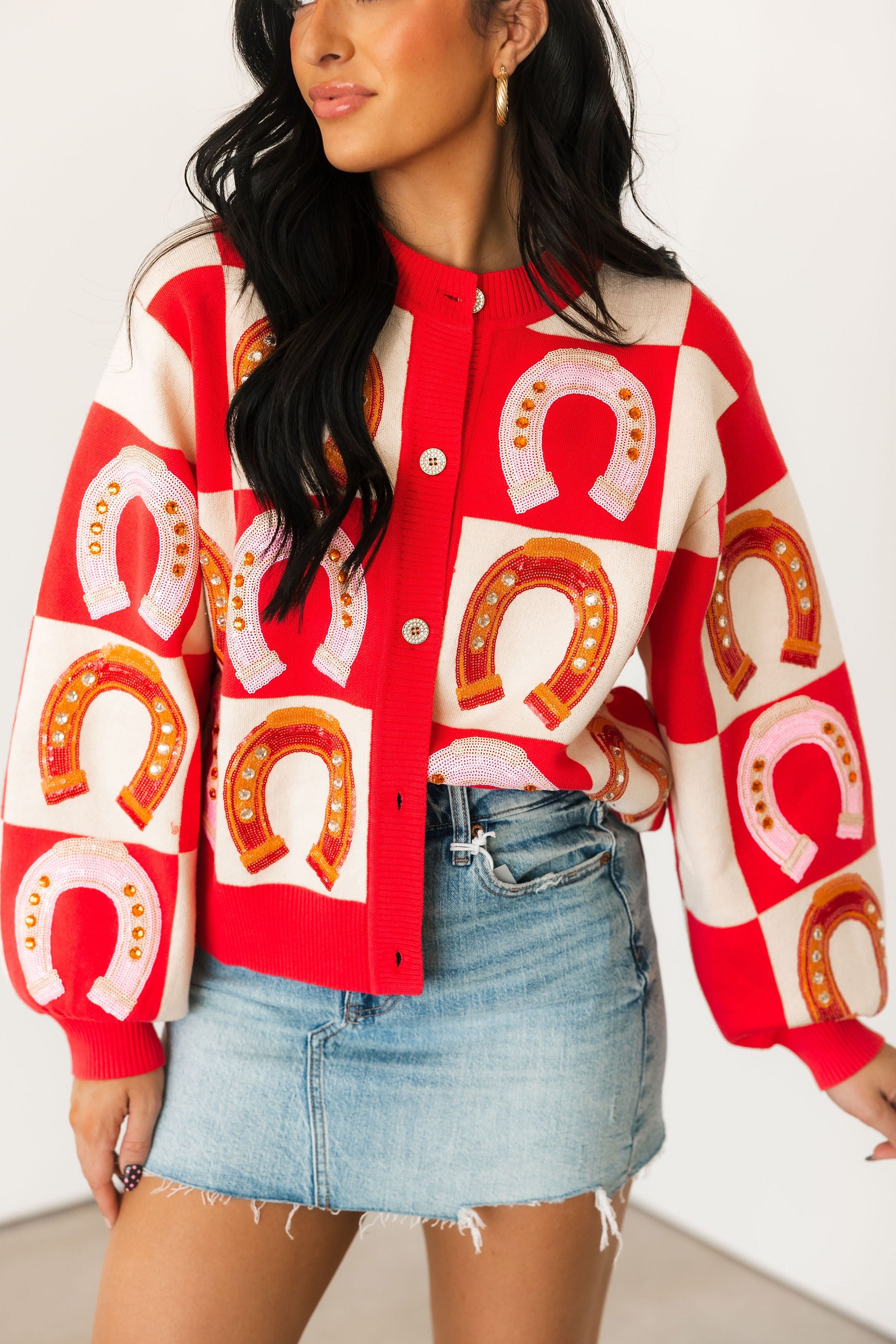 Hot Pink Checkered Horse Shoe Button Up Sweater | Queen Of Sparkles