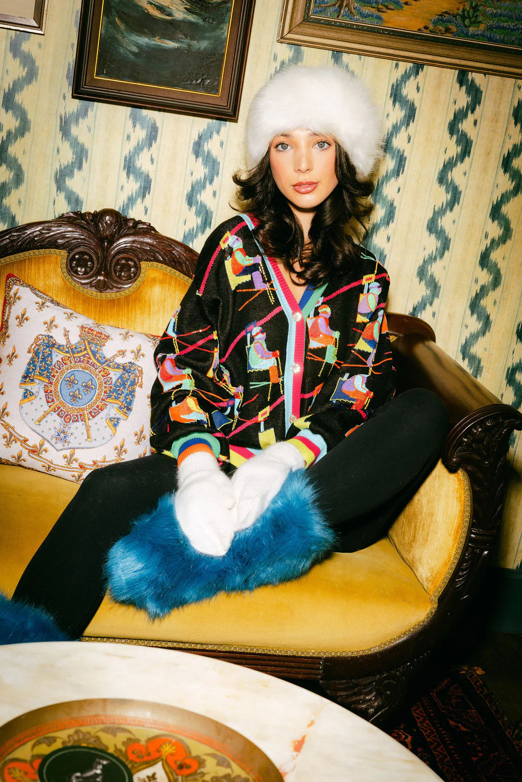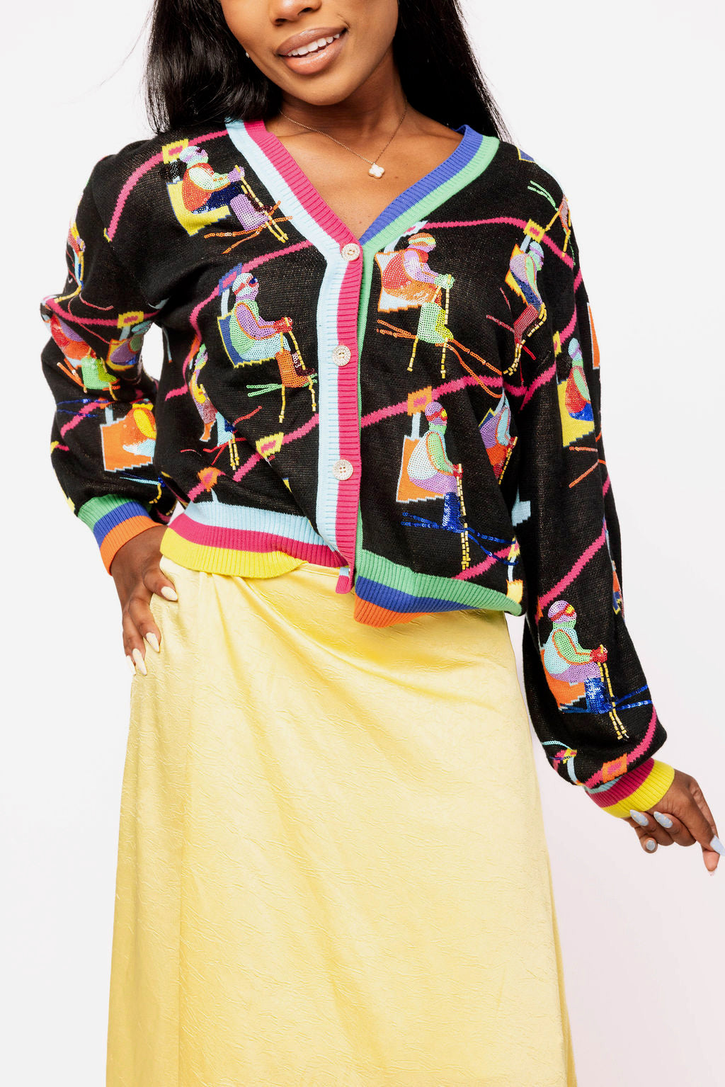 Black Multi Skier On Ski Lift Button Up Cardigan | Queen Of Sparkles