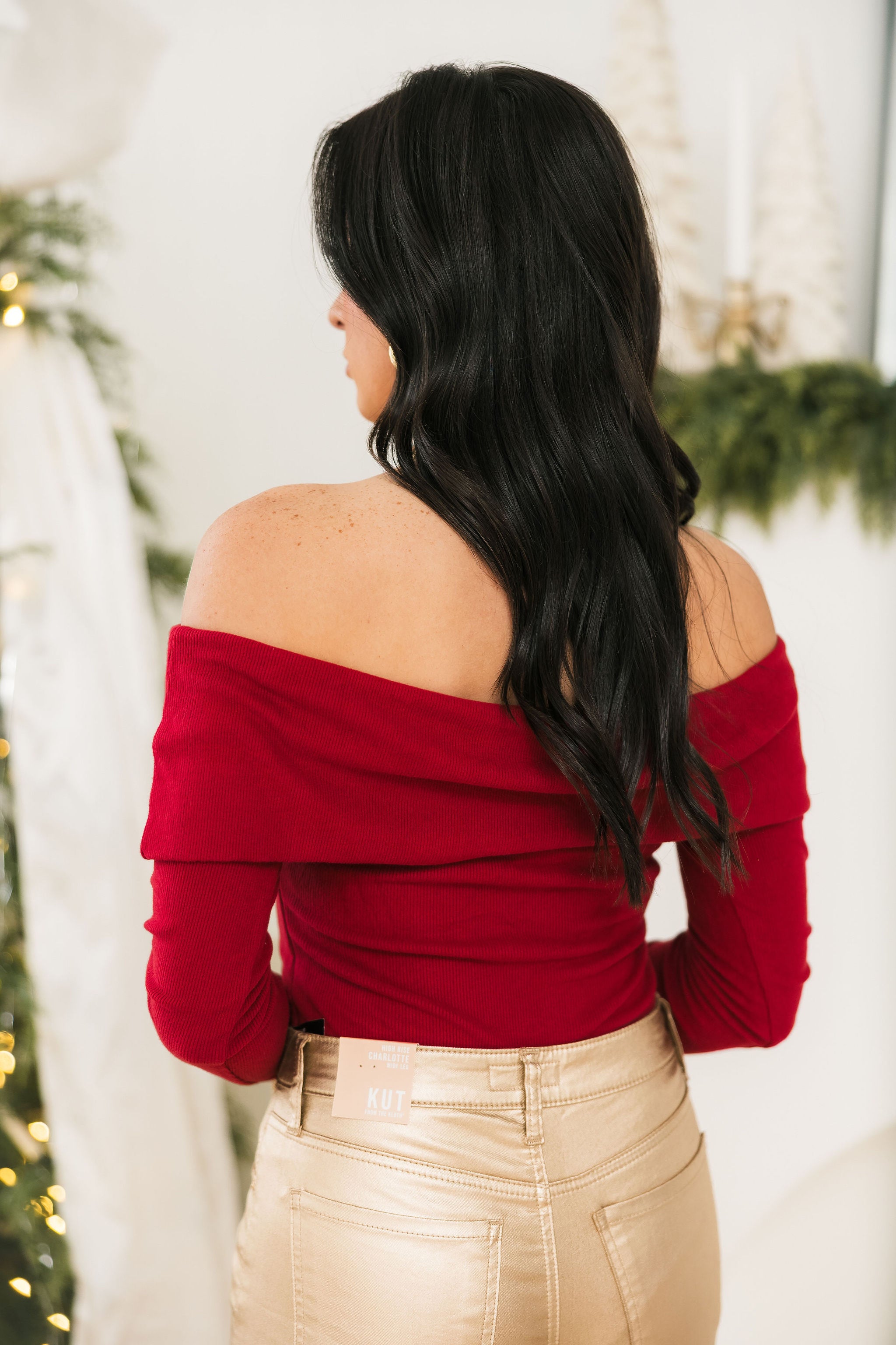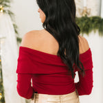 Make a statement in the All Eyes On Me Top in Crimson — a sleek, fitted bodysuit that’s both bold and flattering. The off-the-shoulder neckline and ribbed texture create a look that’s equal parts confident and chic. Sage is wearing an xs.