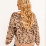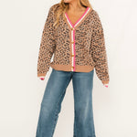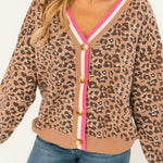 The Almost October Cardigan in camel features a relaxed fit with functional button closures, a bold leopard print, and eye-catching pink, white, and camel stripe hem detailing. Perfect for layering over basics to instantly elevate your fall look. Lexi is wearing a small.