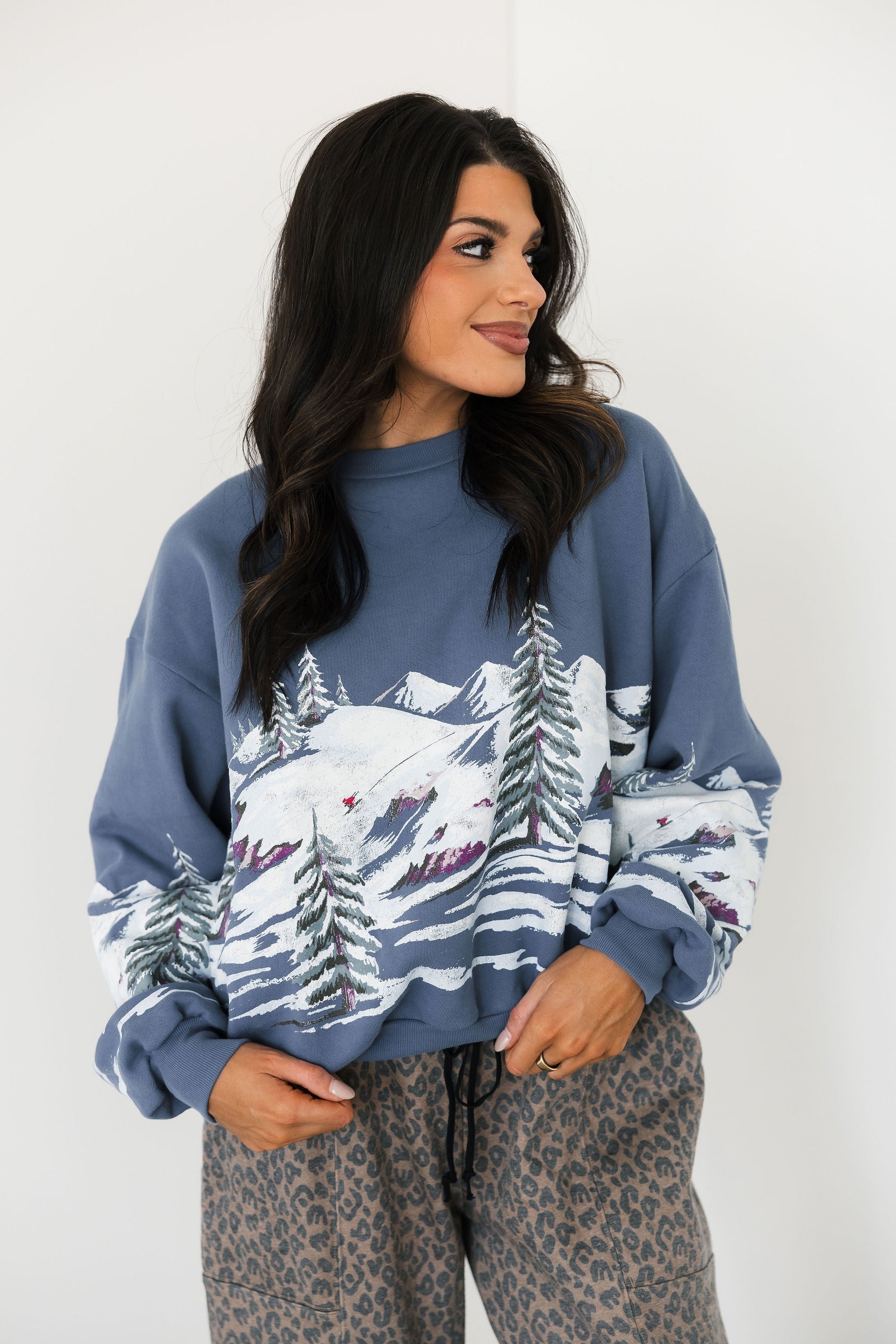 The Daydreamer Alpine Ski Oversized Crew Sweatshirt features a roomy, oversized fit with a classic crew neckline and long sleeves for that perfectly slouchy silhouette. Soft and comfortable with a worn-in feel, this sweatshirt is ideal for casual layering, lounging, or adding a relaxed touch to everyday looks. Harli is wearing a S/M.