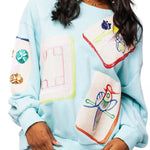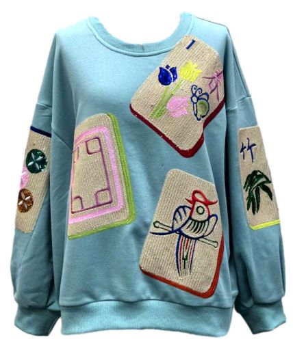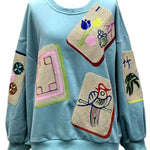 The Queen Of Sparkles Aqua Scattered Mahjong Tile Sweatshirt features an oversized, relaxed fit with a classic crewneck and long sleeves. Perfect for layering or wearing solo, it brings a fun, statement-making touch to casual outfits.