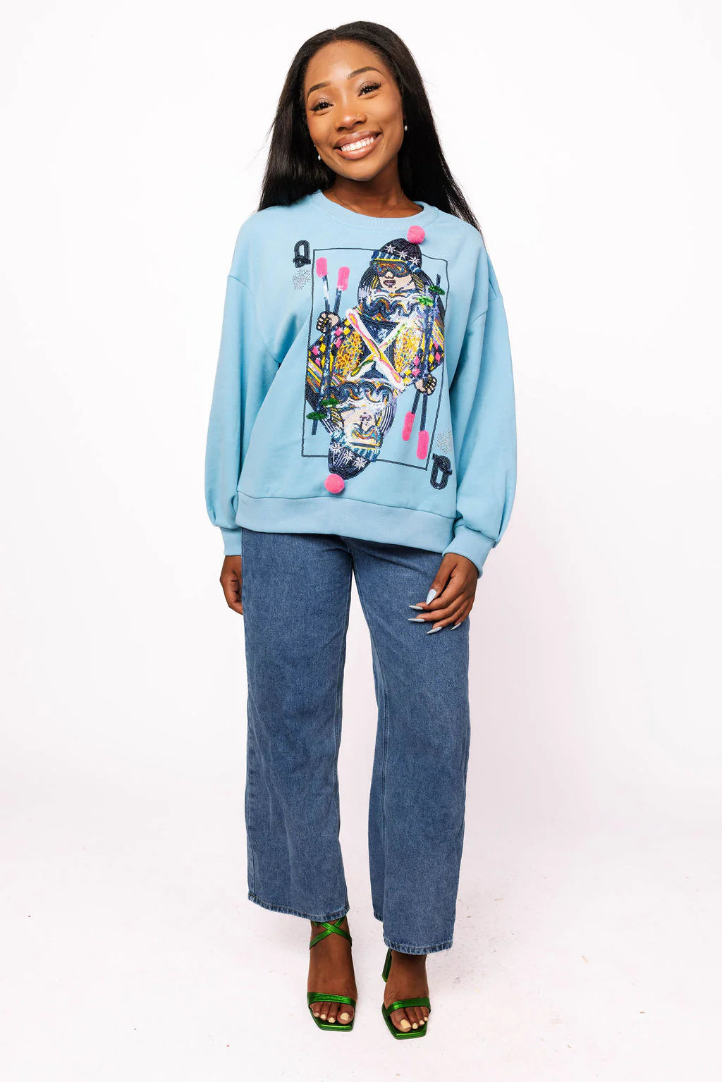 The Queen Of Sparkles Aqua Ski QOS Card Sweatshirt is the ultimate winter statement piece. With its relaxed fit, soft feel, and bold Ski Card graphic, it’s perfect for après-ski lounging or adding a touch of fun to your everyday look. Wear it with leggings for casual comfort, or dress it up with sequined bottoms for a festive winter ensemble.