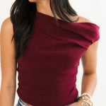A chic twist on a classic knit, this fitted sweater top features an eye-catching asymmetrical neckline that instantly elevates your look. Crafted in a rich wine hue, it’s the perfect blend of cozy and polished—ideal for date nights, dinners, or a sleek day-to-night outfit. Sage is wearing an xs.