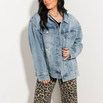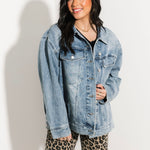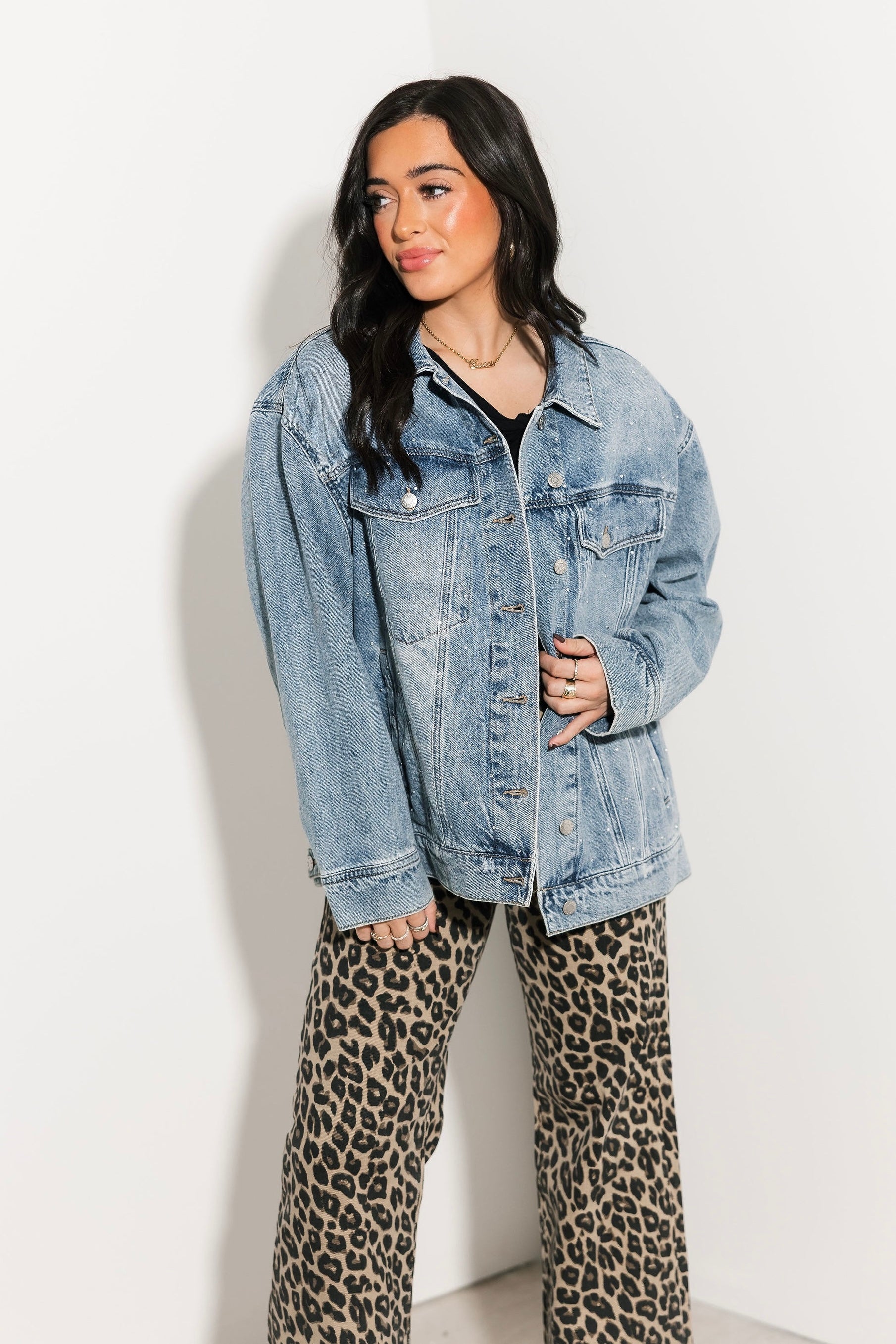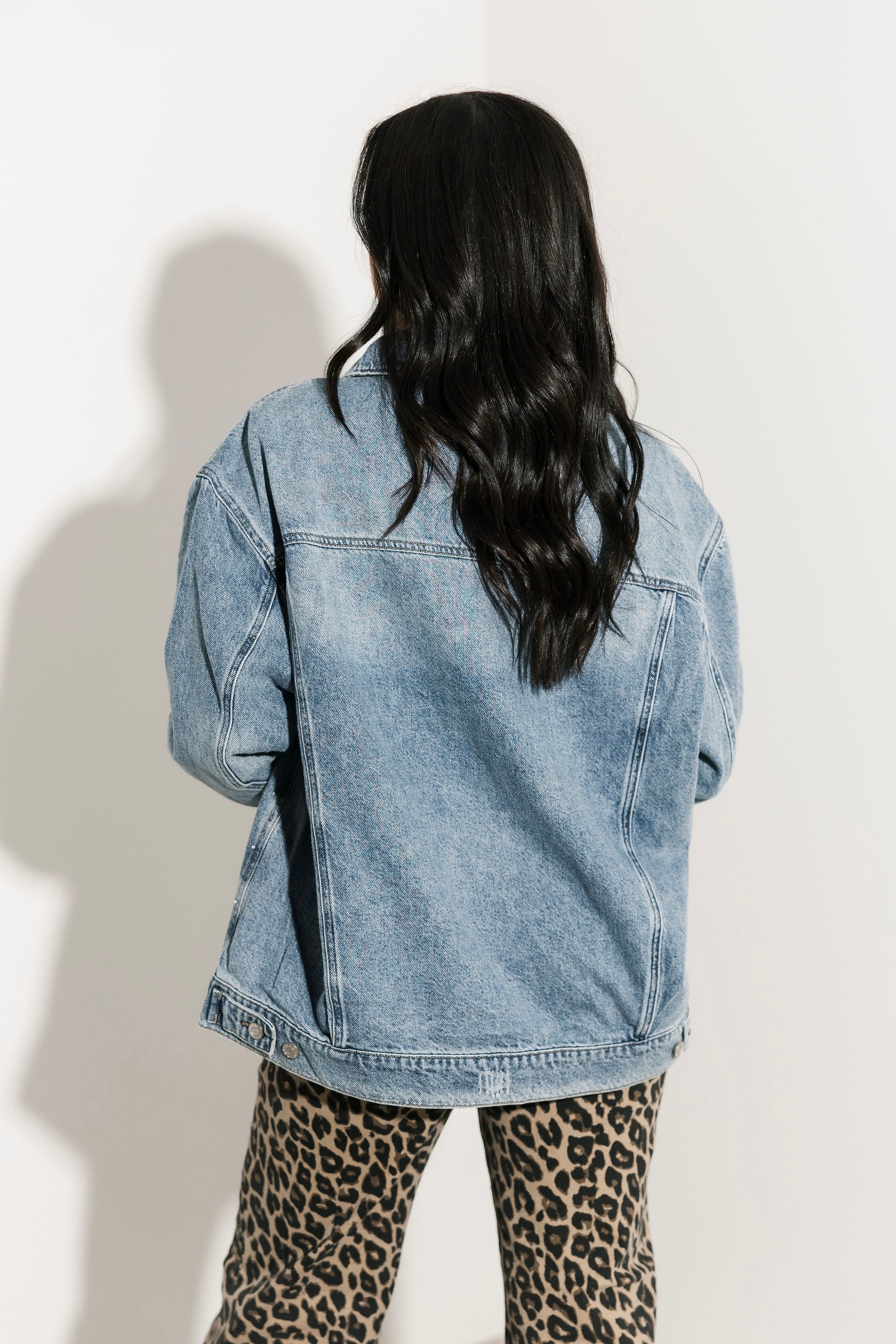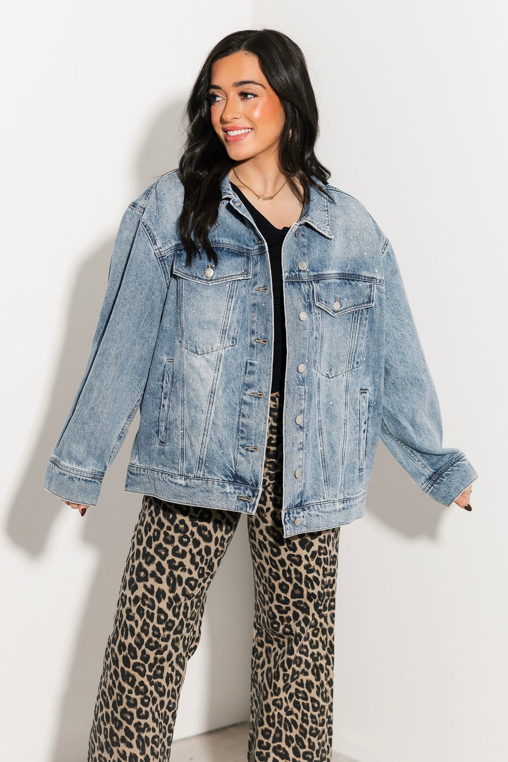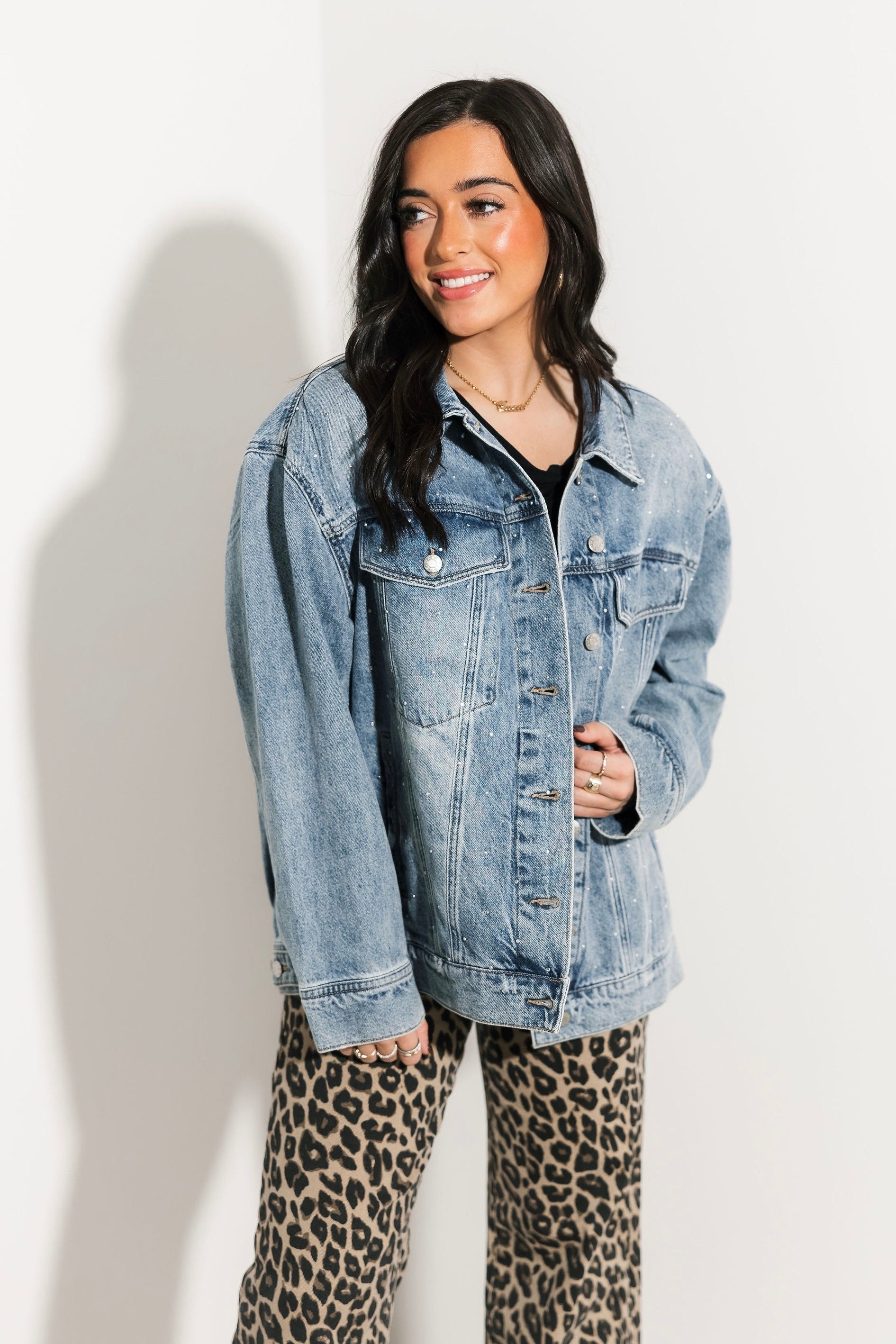 The Beau Boyfriend Denim Jacket in Twinkle features an oversized silhouette, collared neckline, front button closure, and sparkling stud detailing throughout. Bold, versatile, and fun, it’s perfect for adding instant personality and shine to any casual outfit. Sage is wearing a small.