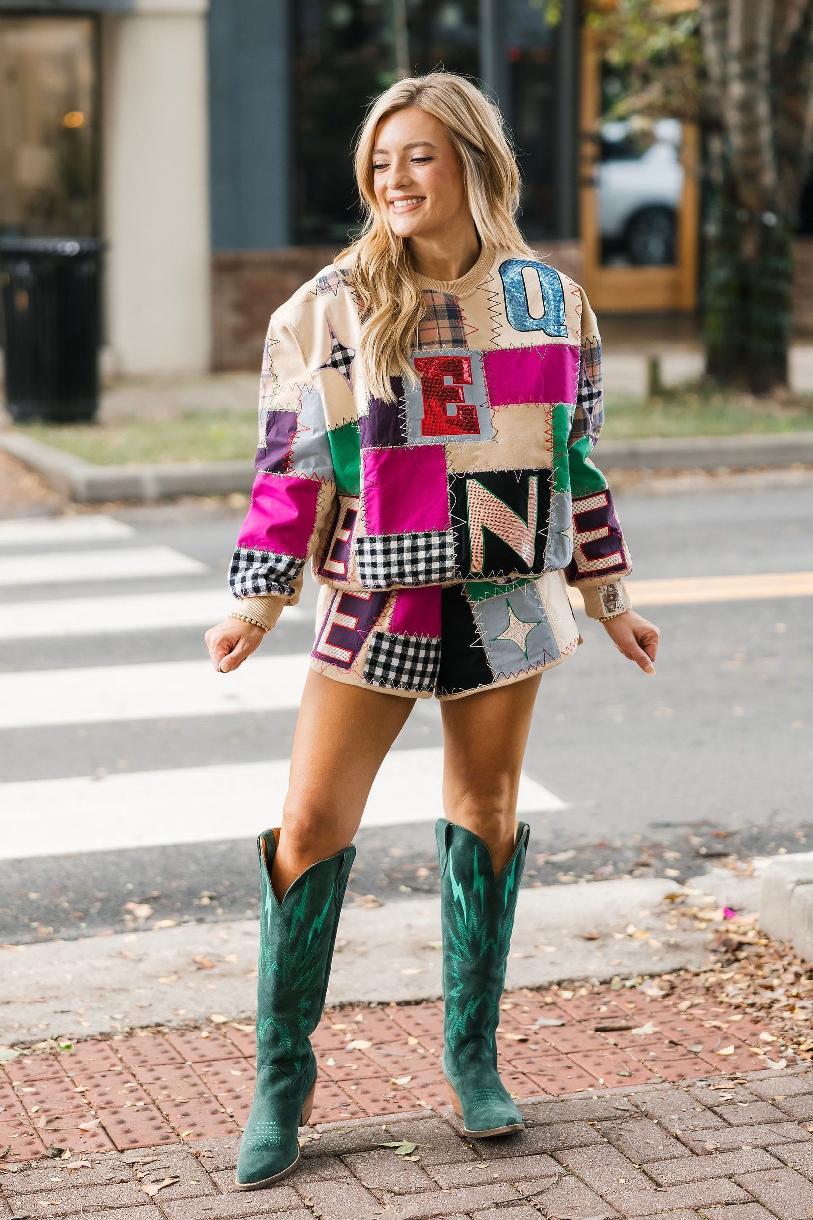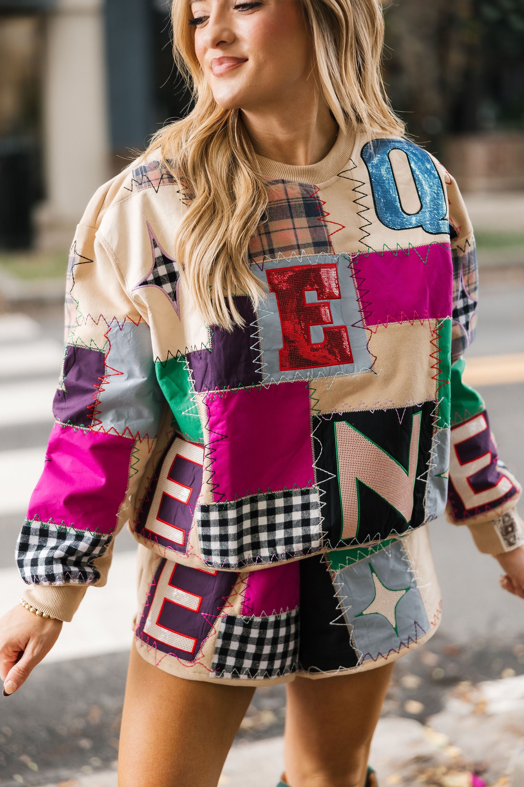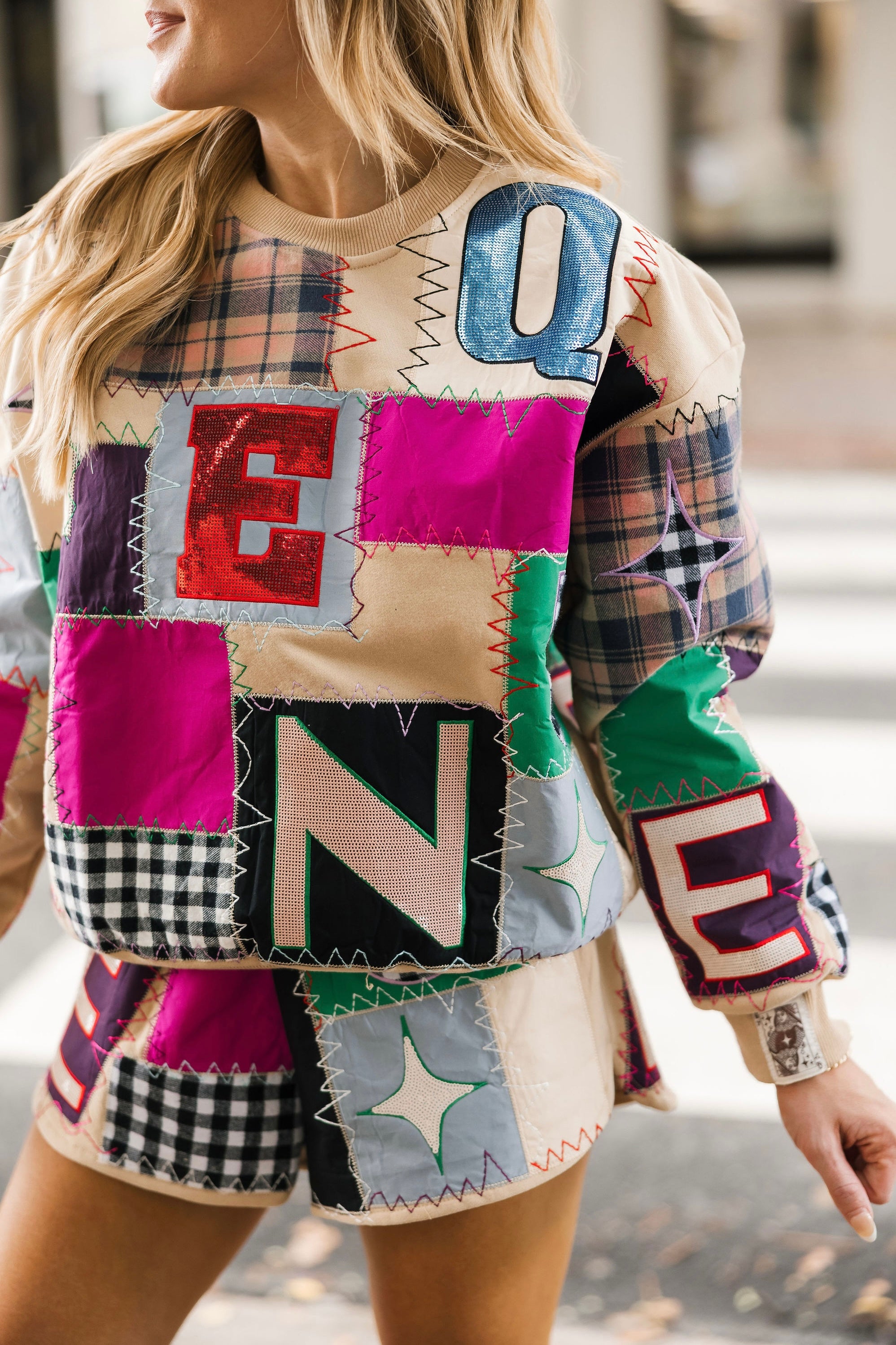 Beige Mutli Queen Patchwork Sweatshirt | Queen Of Sparkles