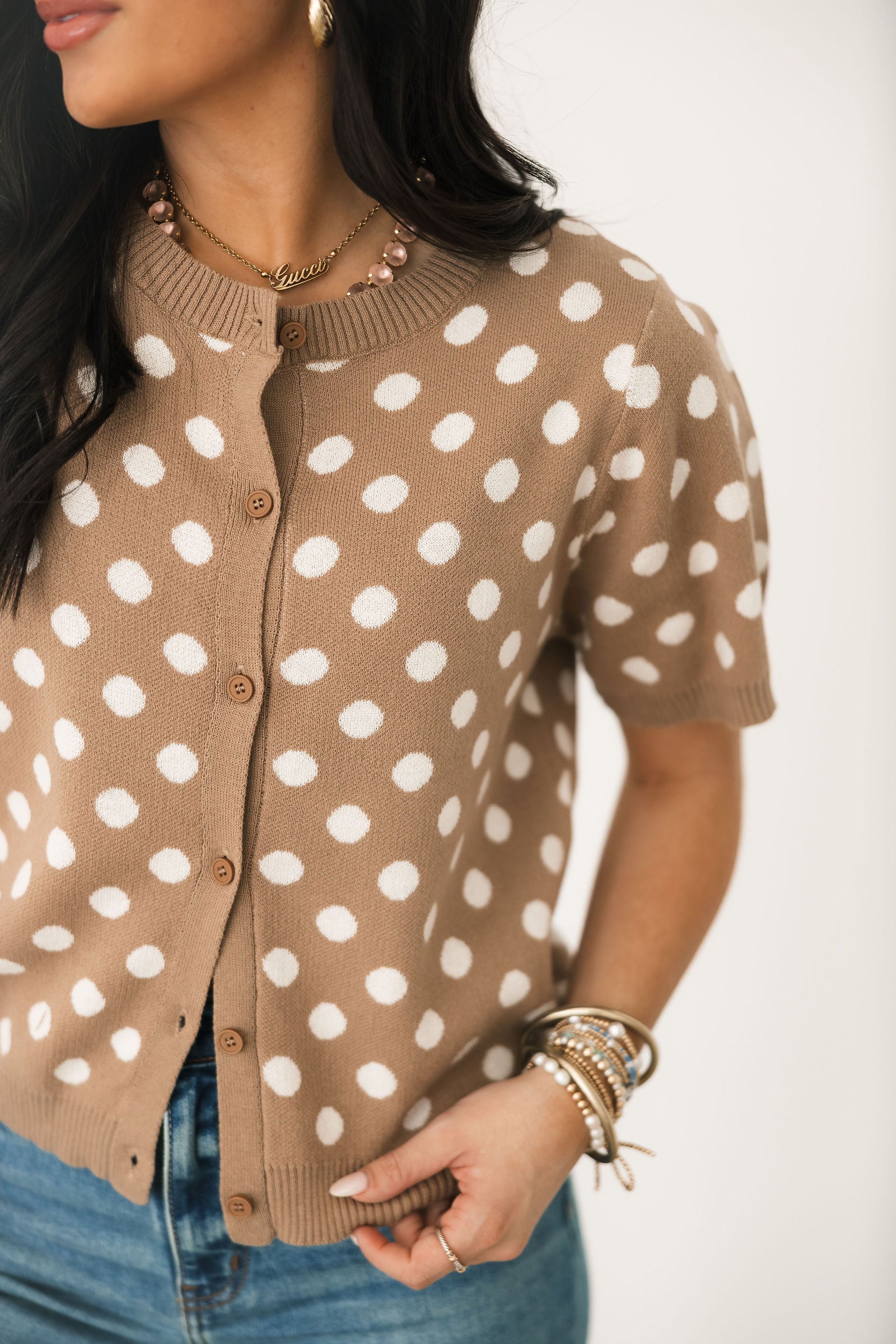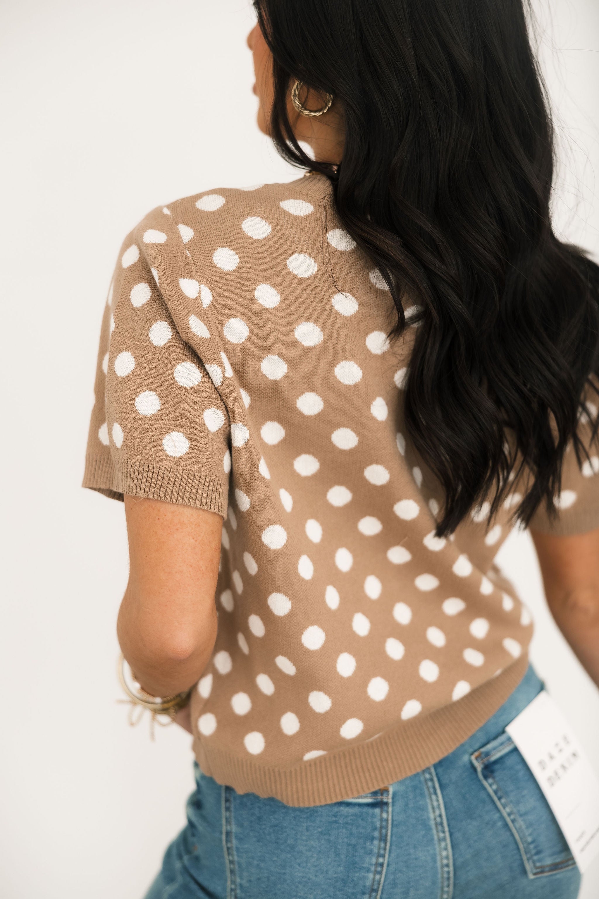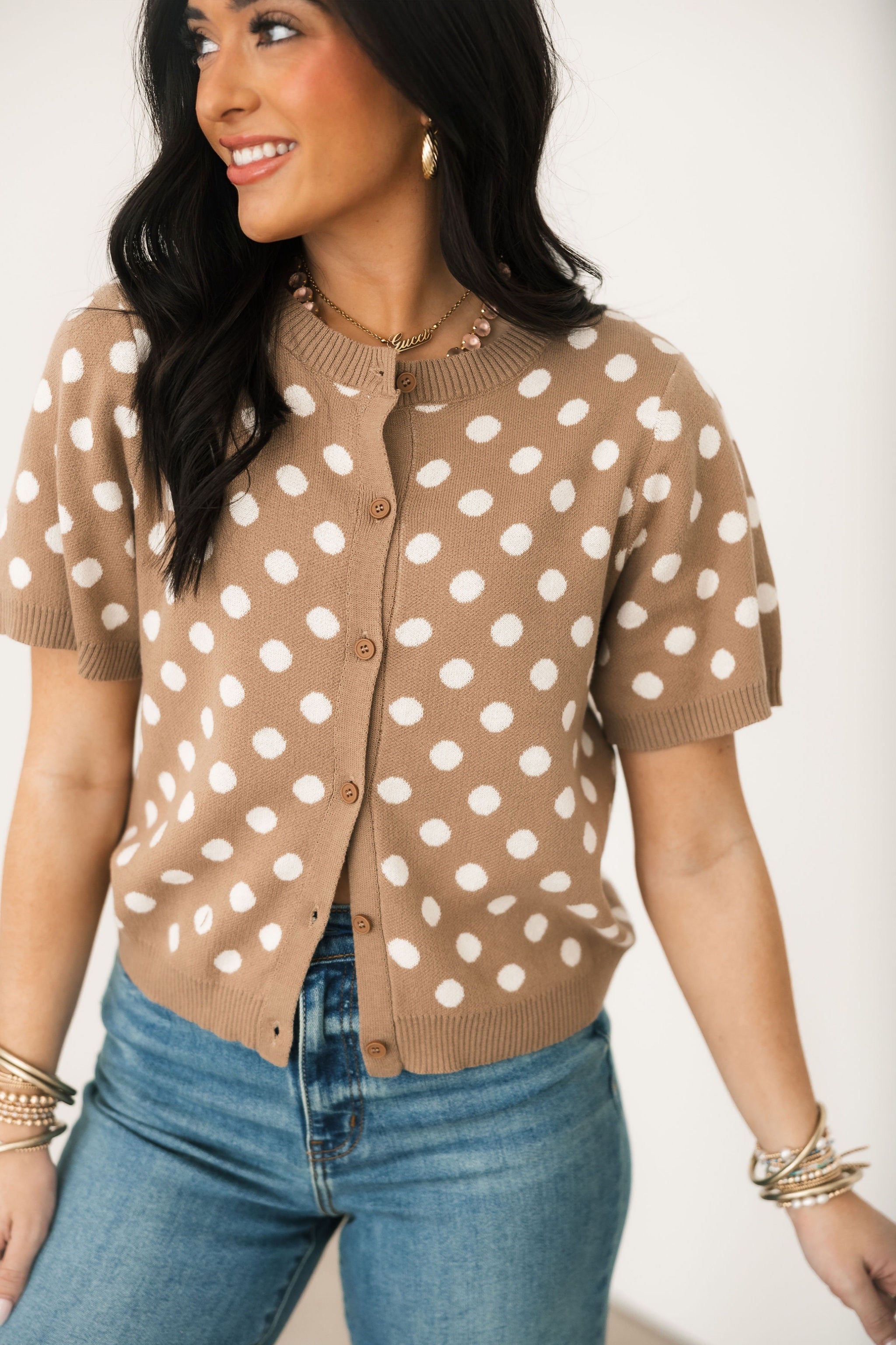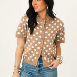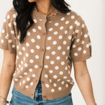 The Polka Dot Sweater Top In Taupe features a knit polka dot sweater with a front button closure and short sleeves. A timeless piece that pairs well with denim or with your favorite skirt, this top has so many ways to wear! Sage is wearing a small.
