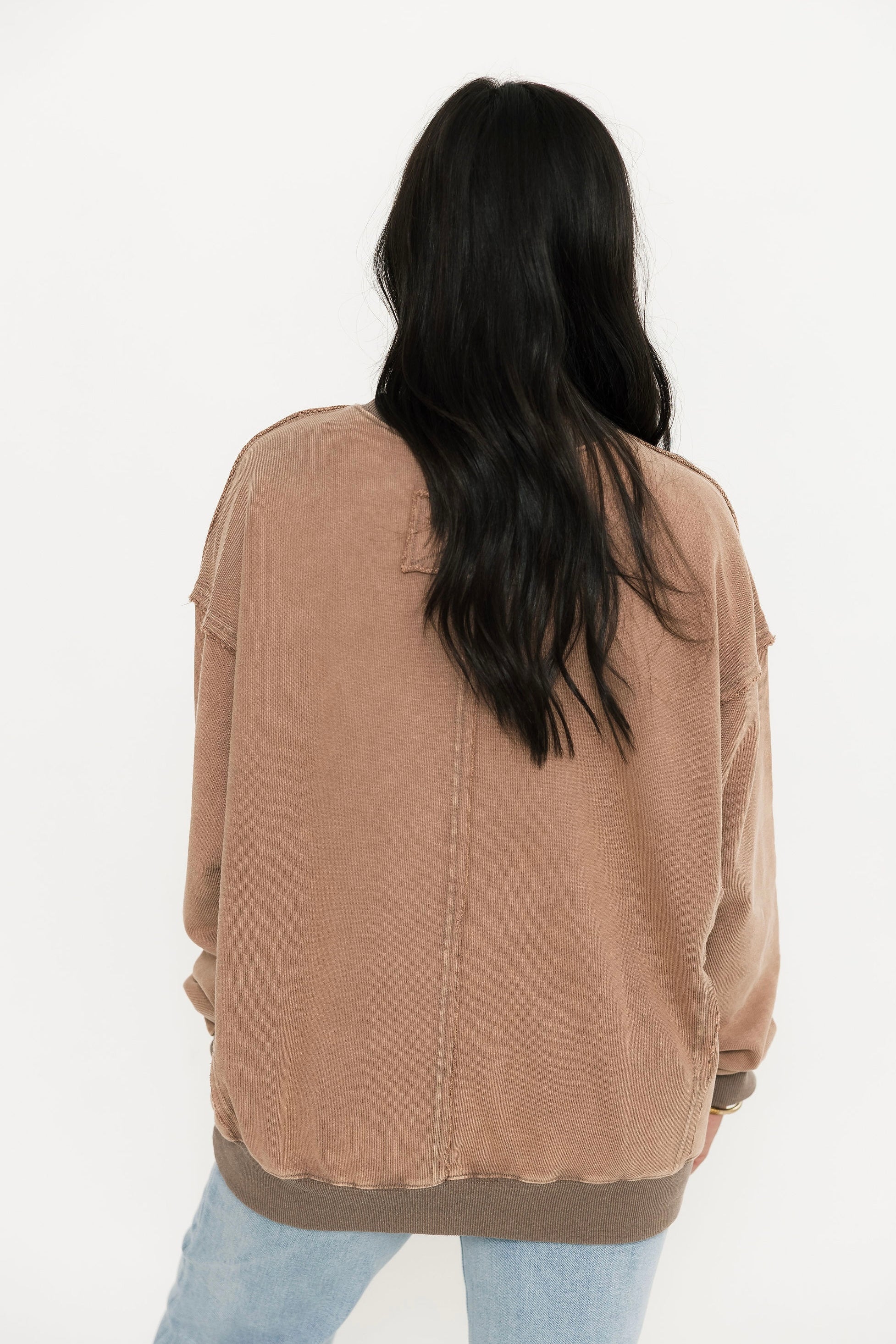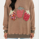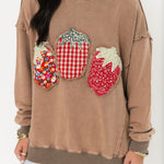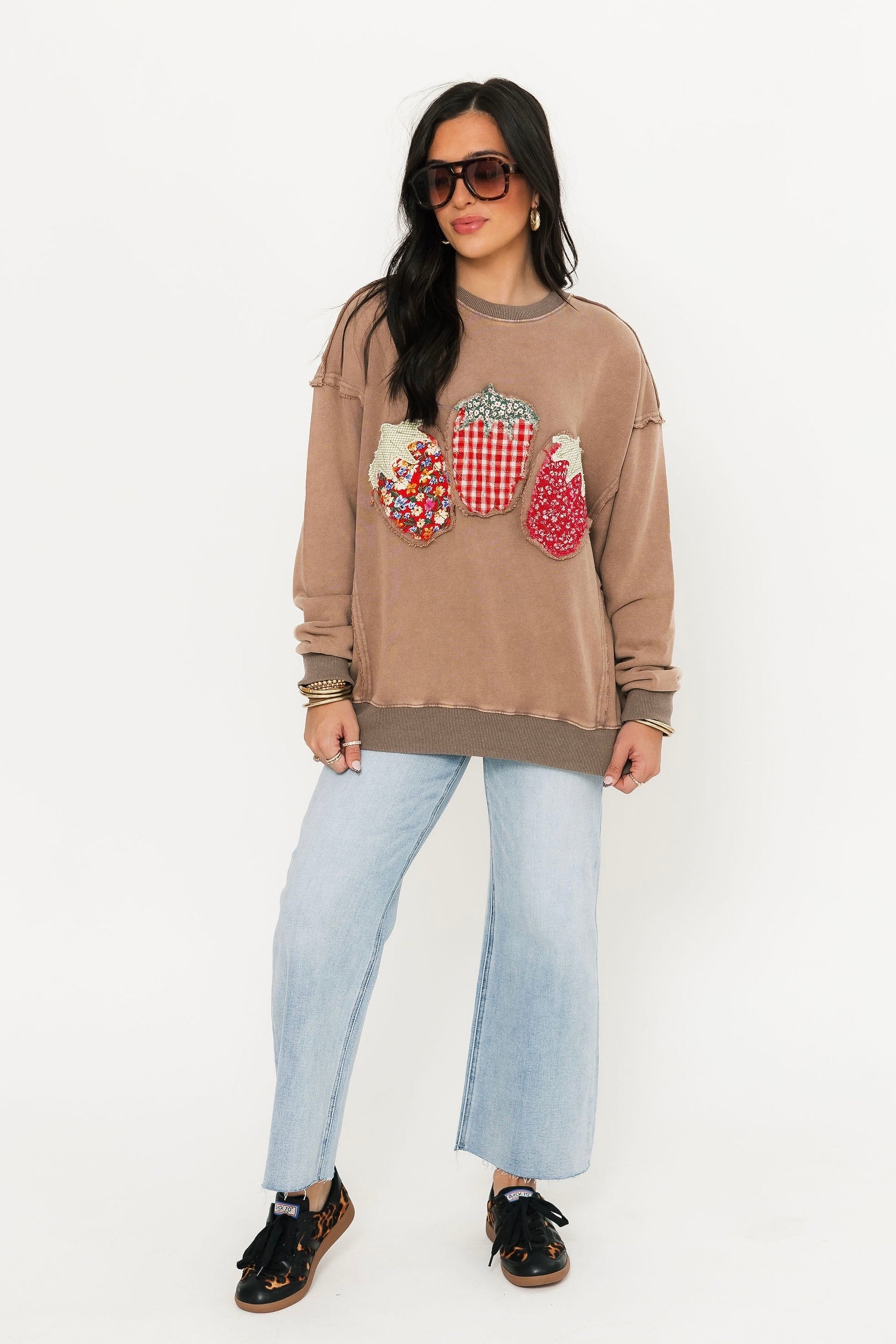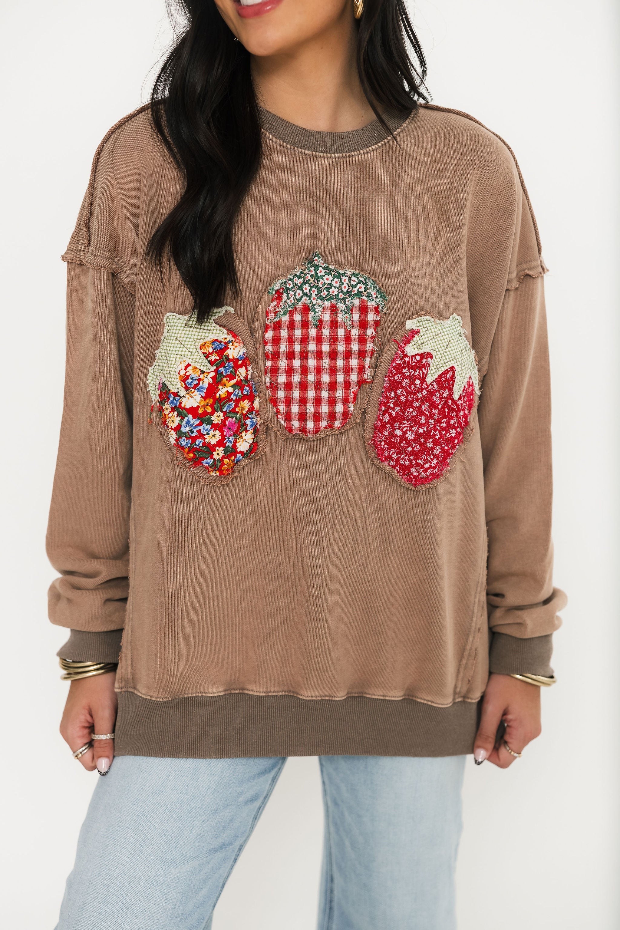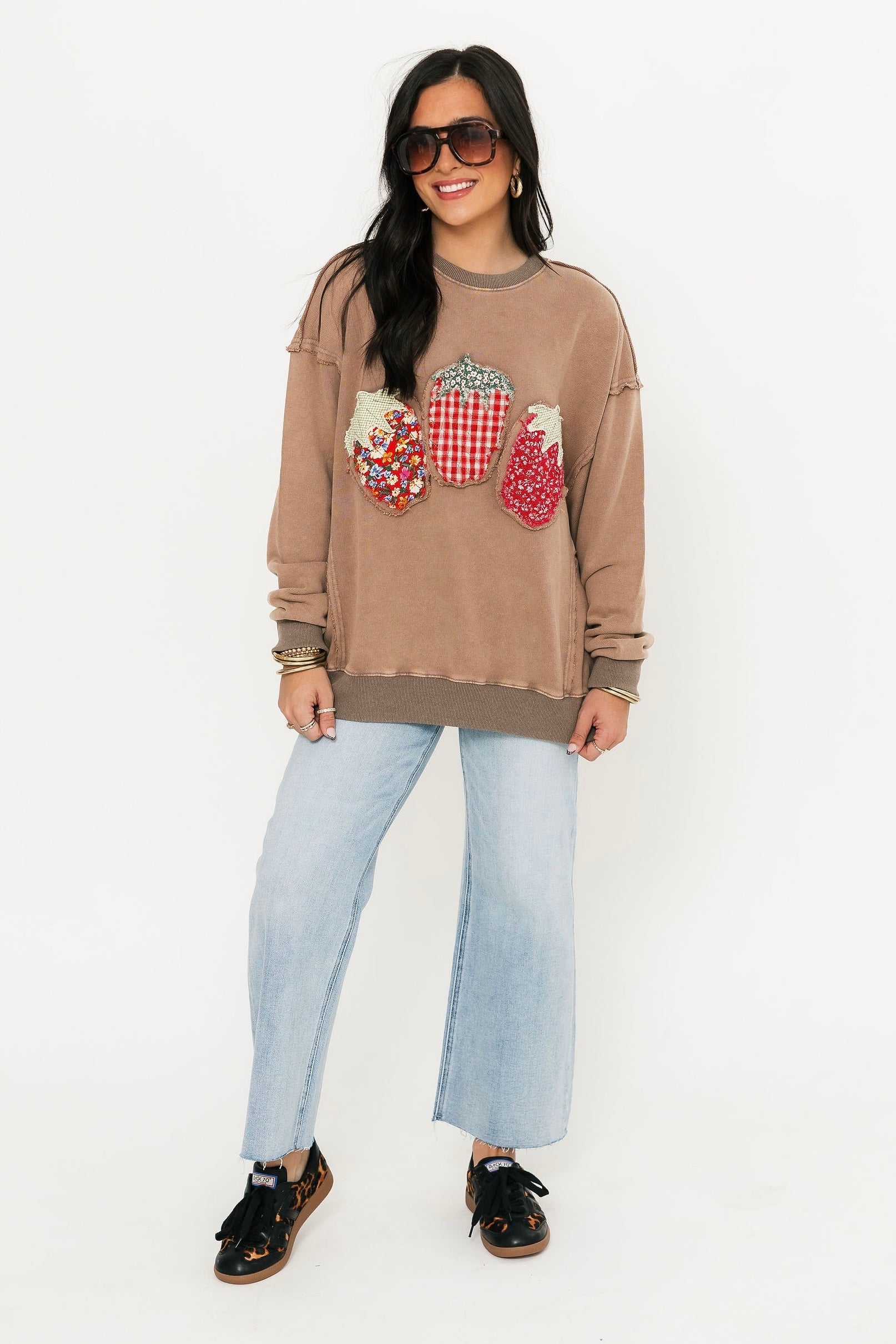 A little bit cozy, a little bit sweet — this oversized pullover is covered in the cutest strawberry patchwork that’s guaranteed to brighten your day. With its slouchy fit, drop shoulders, and soft knit feel, it’s made for lazy mornings and happy moments. Sage is wearing a small.