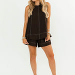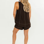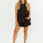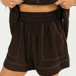 Comfy, cool, and made for everyday wear—the Better Days Shorts in Brown feature a high-waist pull-on style, contrast exposed stitching, front cargo pockets, and an elastic waistband. Pair them with the matching top for a laid-back, utility-chic set. Lexi is wearing a small.