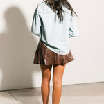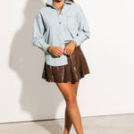 So sleek with an effortless touch of edge, this timeless mini skirt has endless ways to wear. Harli is wearing a medium.