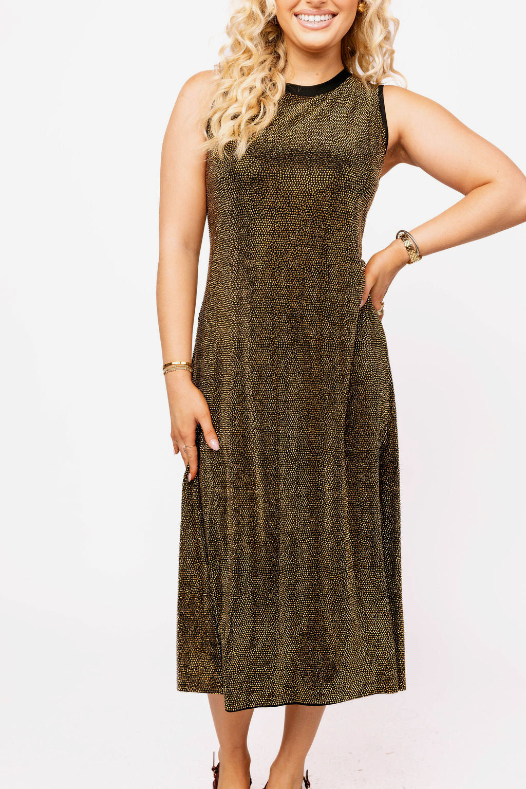 - Why We ❤ It: Sparkle meets sporty—this sleeveless midi dress is covered in shimmering gold rhinestones, blending casual comfort with statement-making glam.