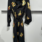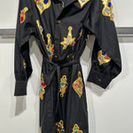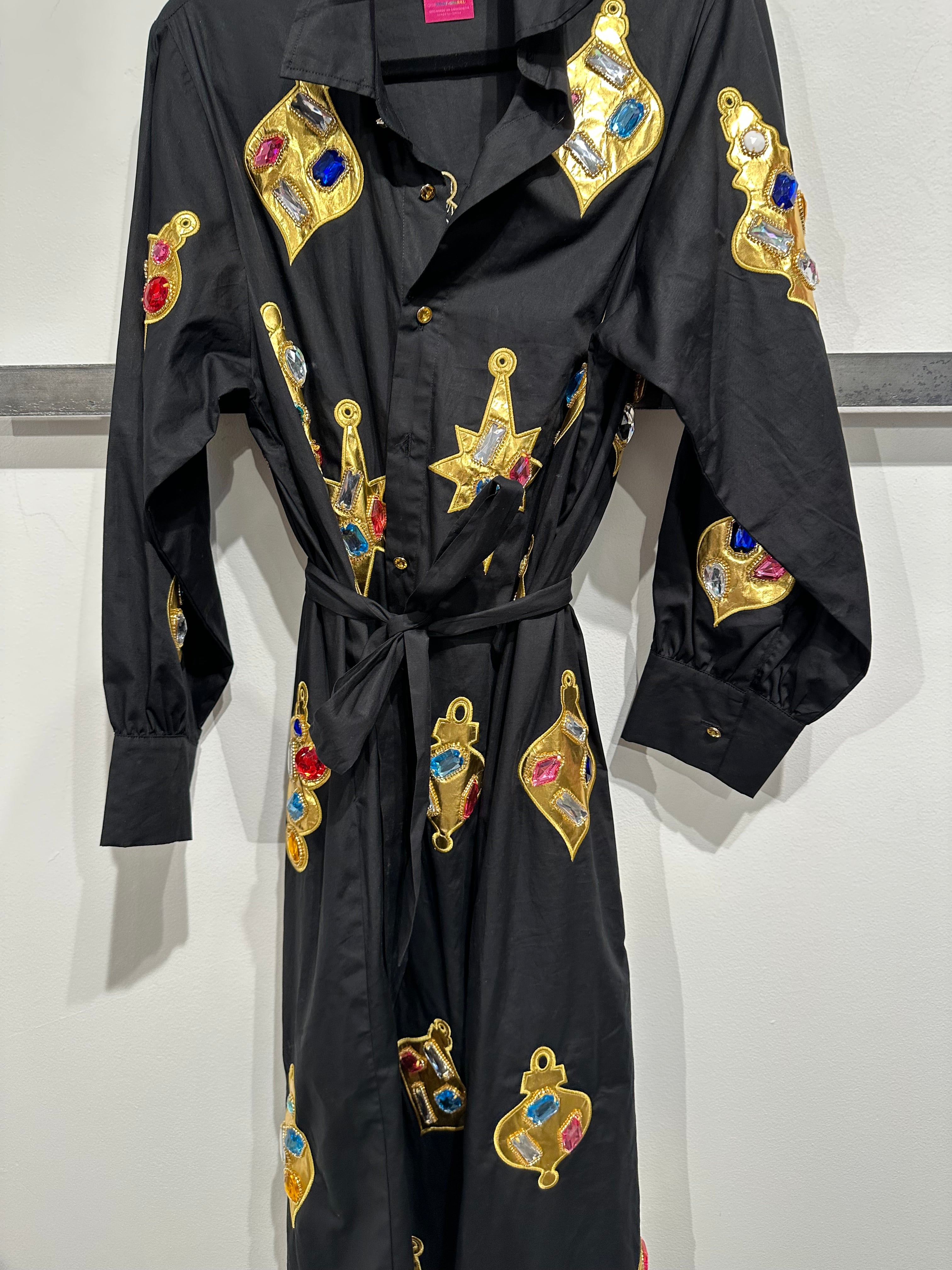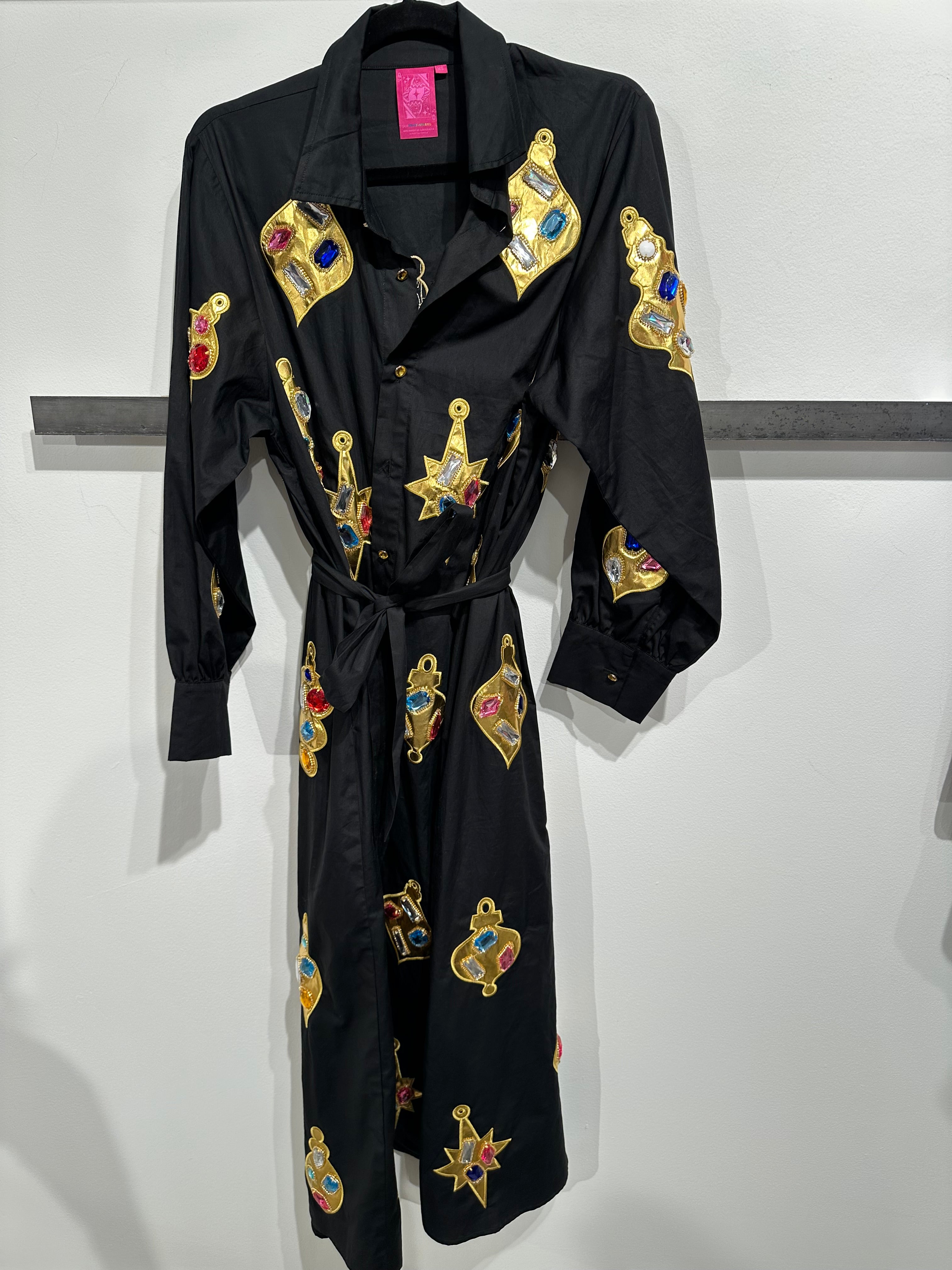The Queen Of Sparkles Black & Gold Jeweled Ornament Cotton Tie Midi Dress is a chic holiday standout with a relaxed fit that’s cinched at the waist for a flattering shape. Featuring a collared neckline, button-down front, midi length, and sparkling ornament graphics, it’s the perfect mix of festive and polished for holiday gatherings or nights out.