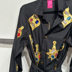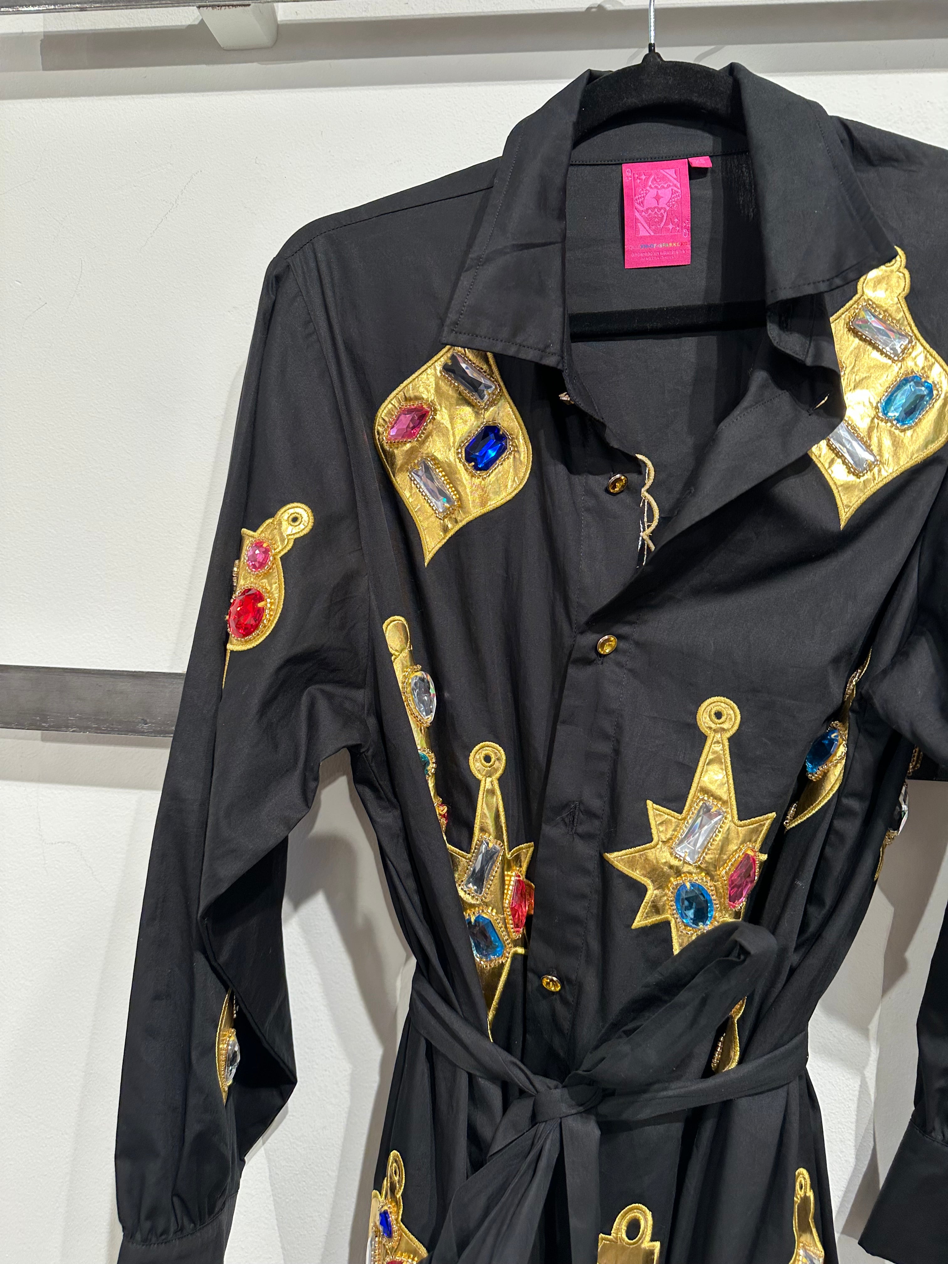 Queen Of Sparkles Black & Gold Jeweled Ornament Cotton Tie Midi Dress