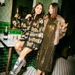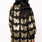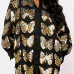 Flit into style with the Queen Of Sparkles Black & Gold Sequin Butterfly Cotton Button Up Dress. Featuring a relaxed fit, classic collar, and dazzling sequin butterfly details, this dress effortlessly balances comfort and glamour. Pair it with heels for a night out or wear it with sneakers for a chic, daytime look that sparkles with every step.